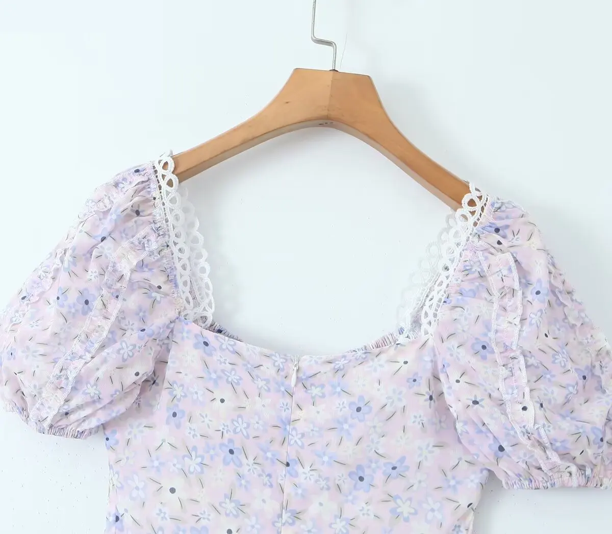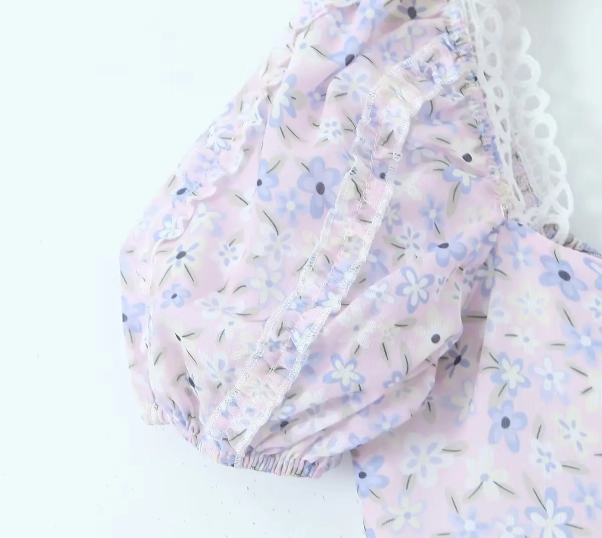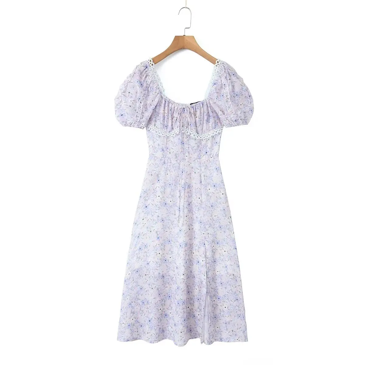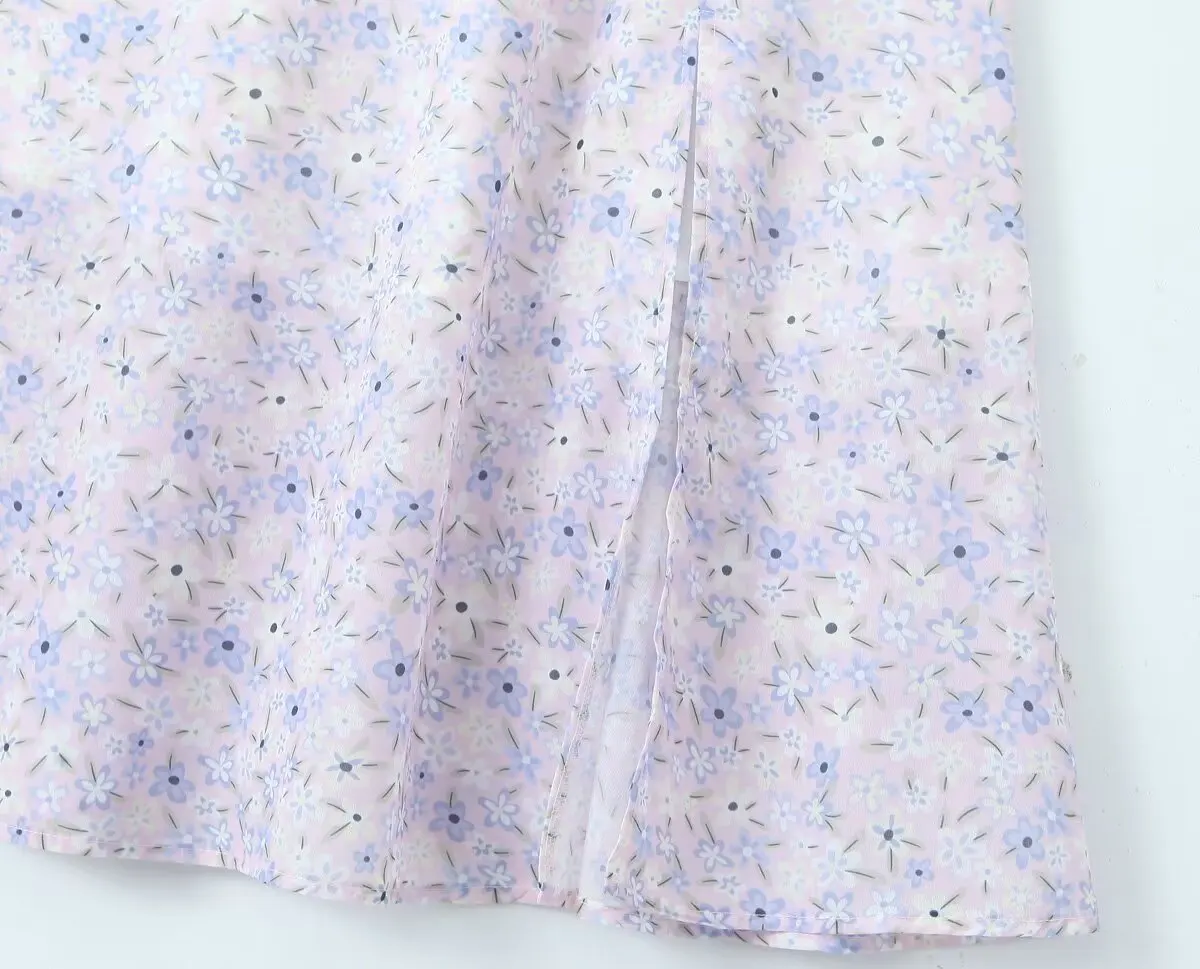 LIZAKOSHT - Sweet Floral Print Holiday Summer Dress Women Vintage Puff Sleeve Slit Hem A-line Midi Dresses French Style Robe