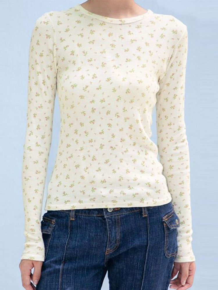 Lizakosht Sweet Floral Print Waffle T-shirts Women Vintage Cute Round Neck Slim Long Sleeve T Shirt Women Casual Harajuku Y2k Crop Top