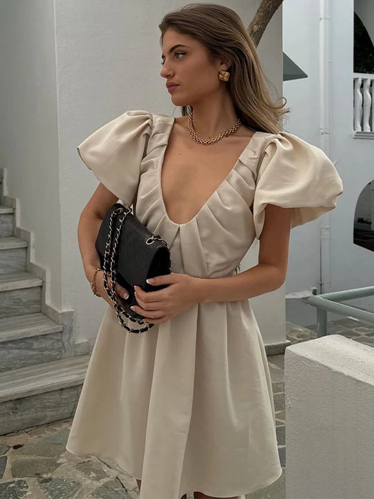 LIZAKOSHT - Sweet Solid Puff Short Sleeve Women Mini Dress Elegant V-neck Backless Pleated A-line Dresses 2024 Summer Lady Party Club Robes