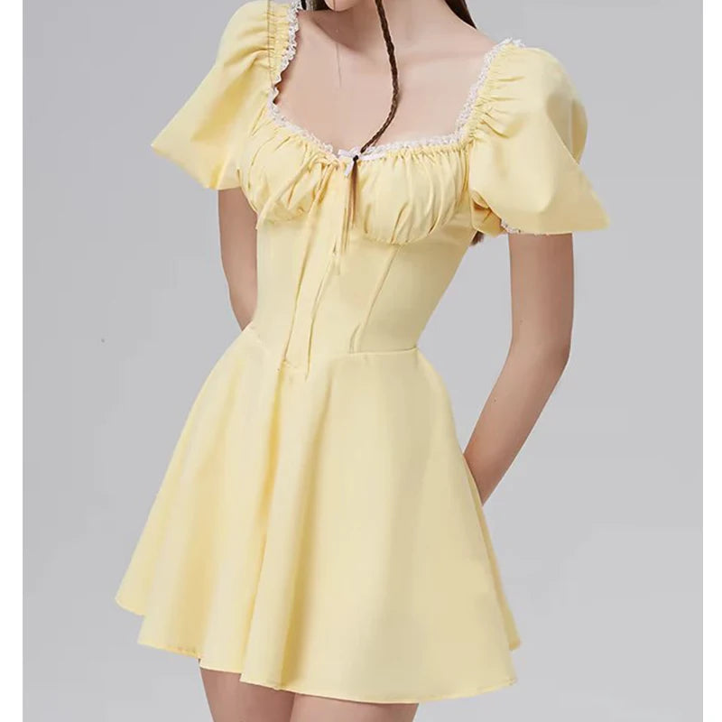 LIZAKOSHT - Sweet Women Lace Trim Yellow Dress Vintage Puff Sleeve Ladies A-line Mini Summer Dresses Lacing Up Robe