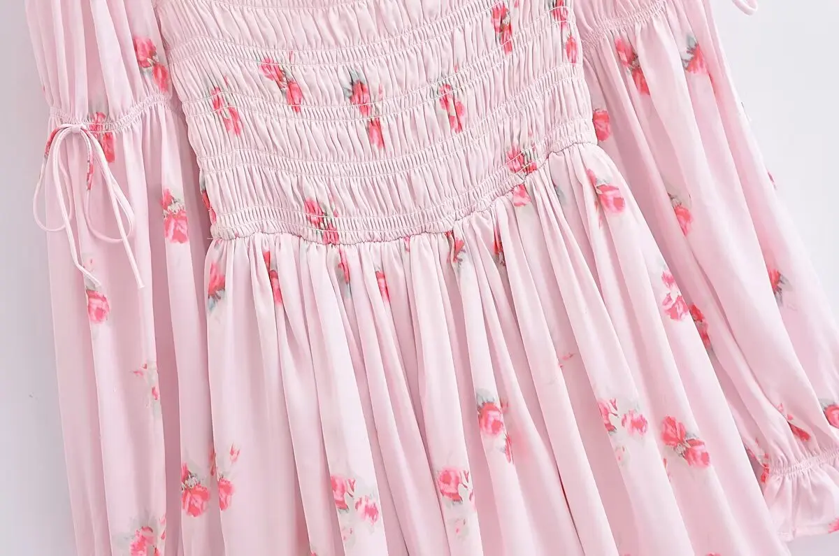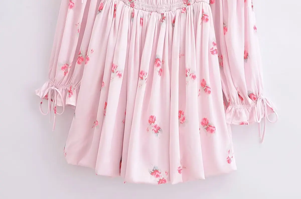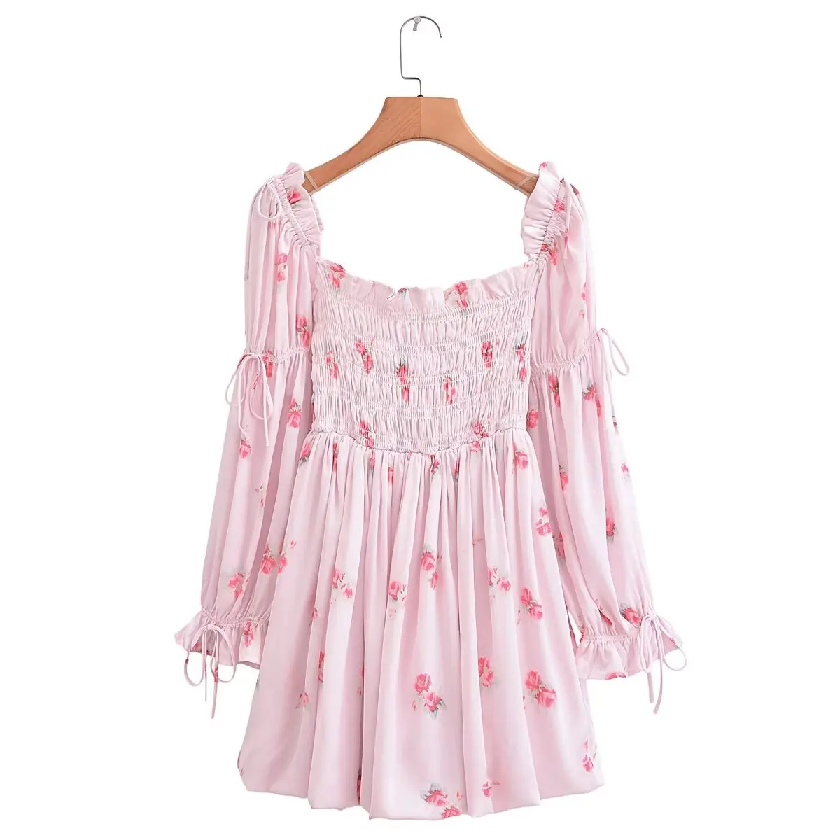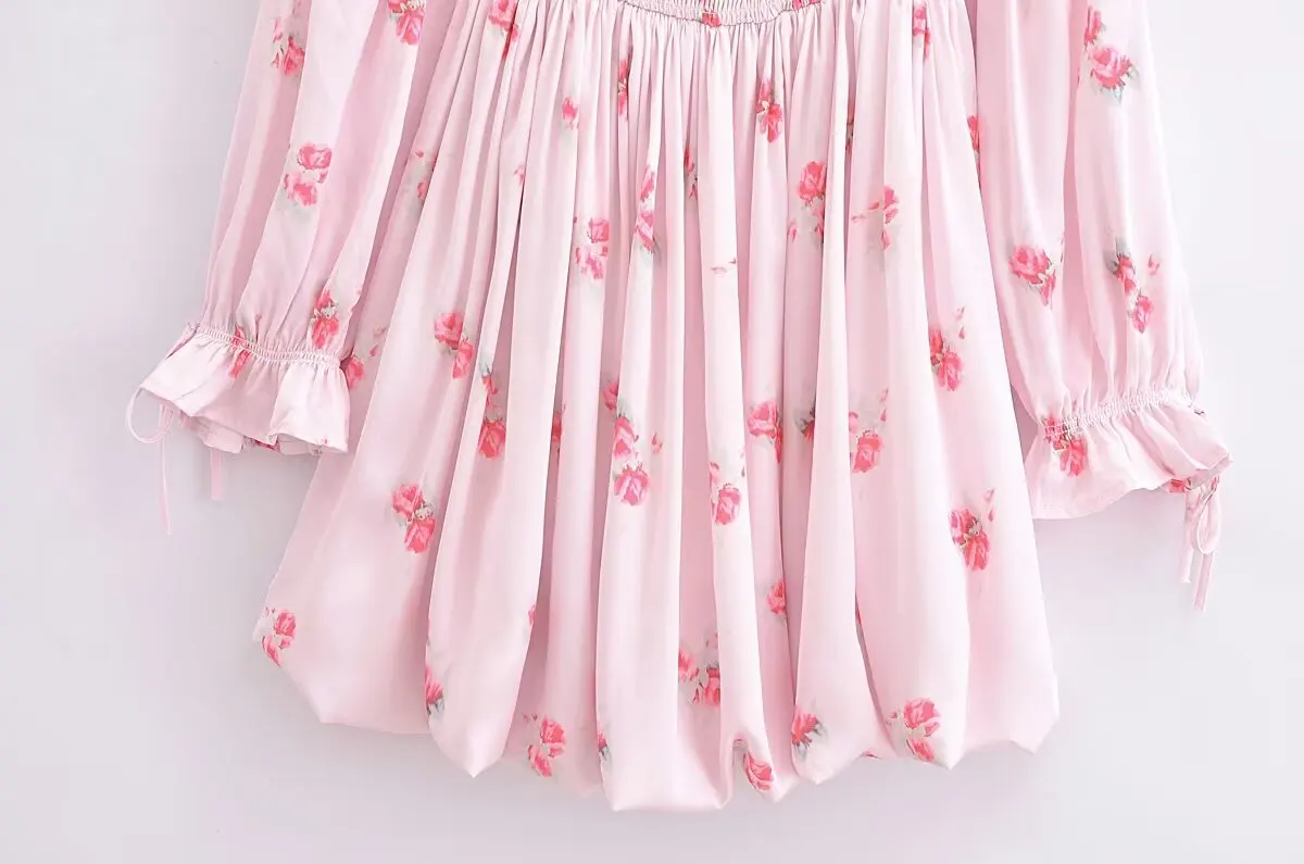 LIZAKOSHT - Sweet Women Pink Floral Print Long Sleeve Holiday Party Princess Mini Dress Summer 2024 Robe