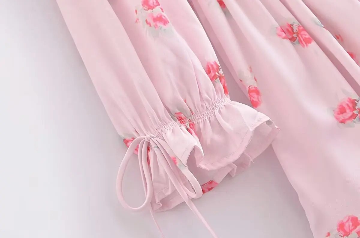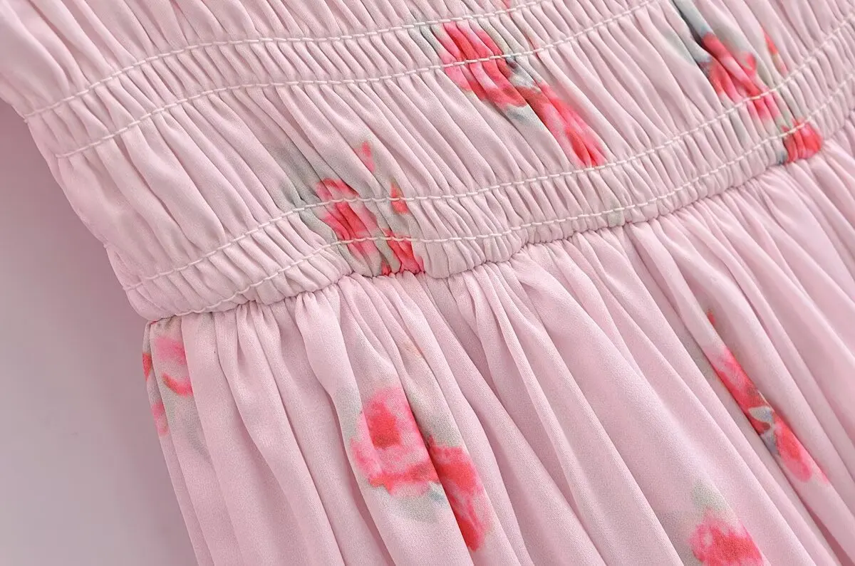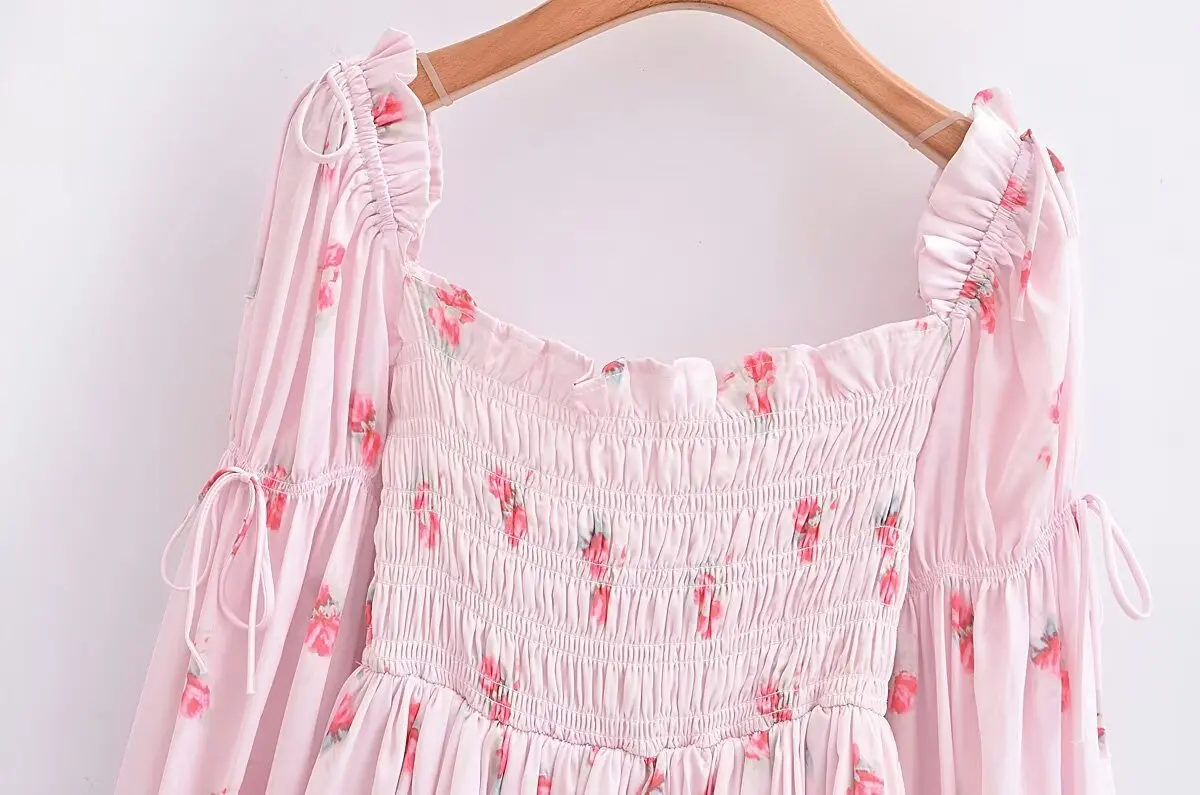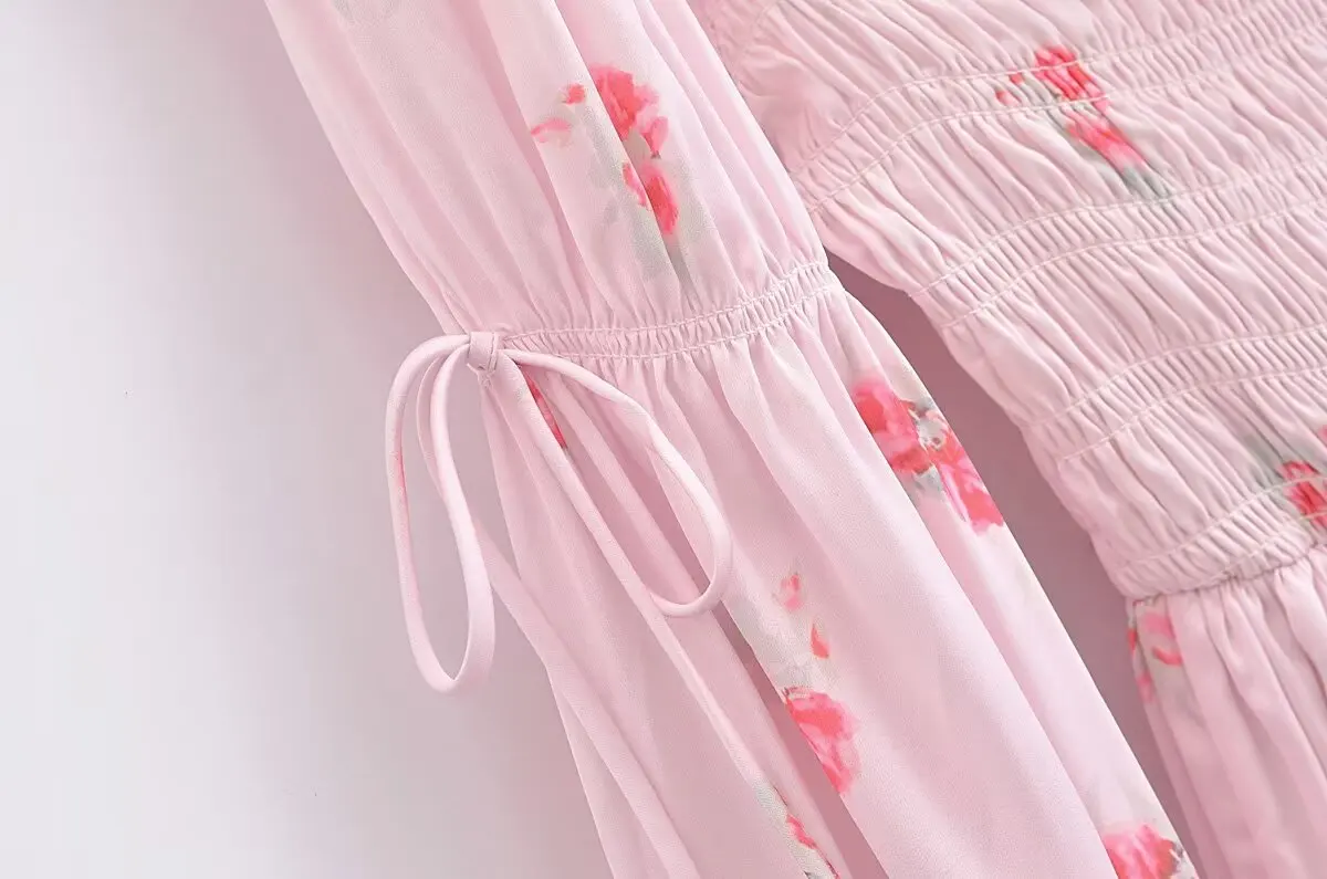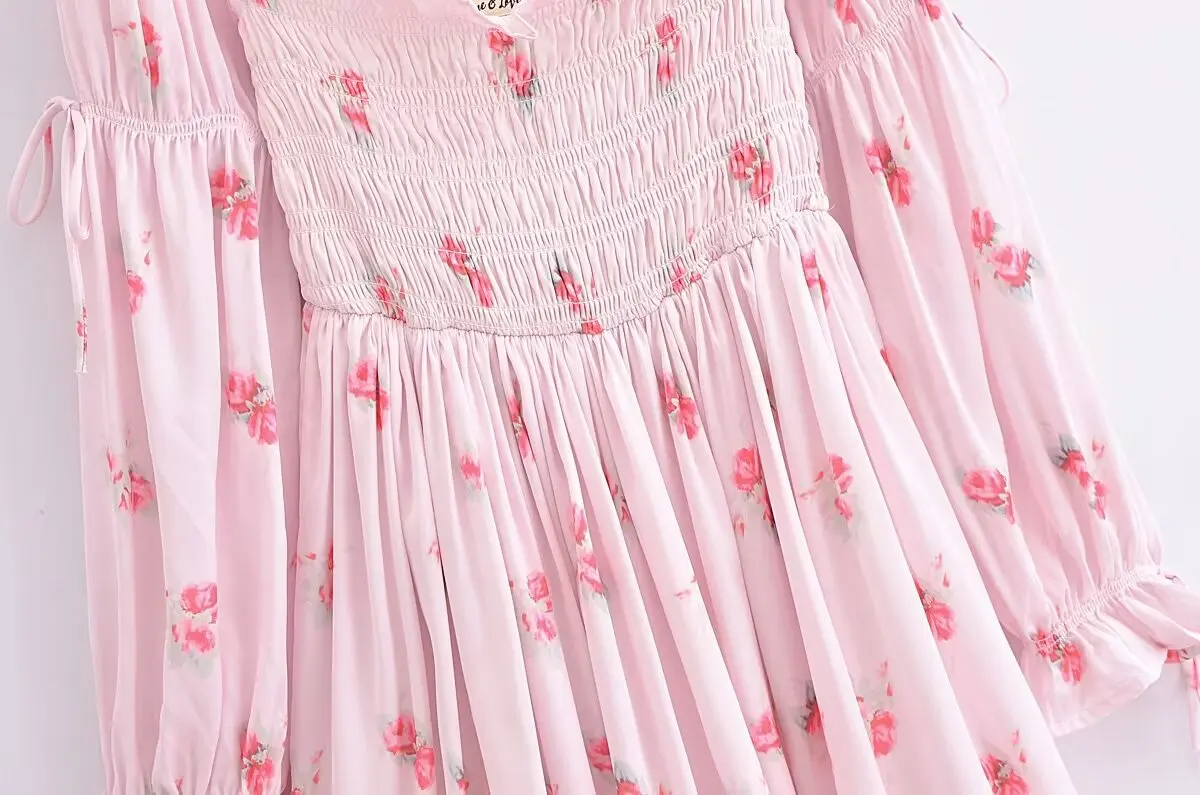 LIZAKOSHT - Sweet Women Pink Floral Print Long Sleeve Holiday Party Princess Mini Dress Summer 2024 Robe