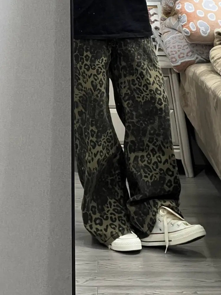 LIZAKOSHT - Tan Leopard Jeans Women Men Denim Pants Oversize Wide Leg Trousers Streetwear Hip Hop Vintage Loose Casual Animal Print American