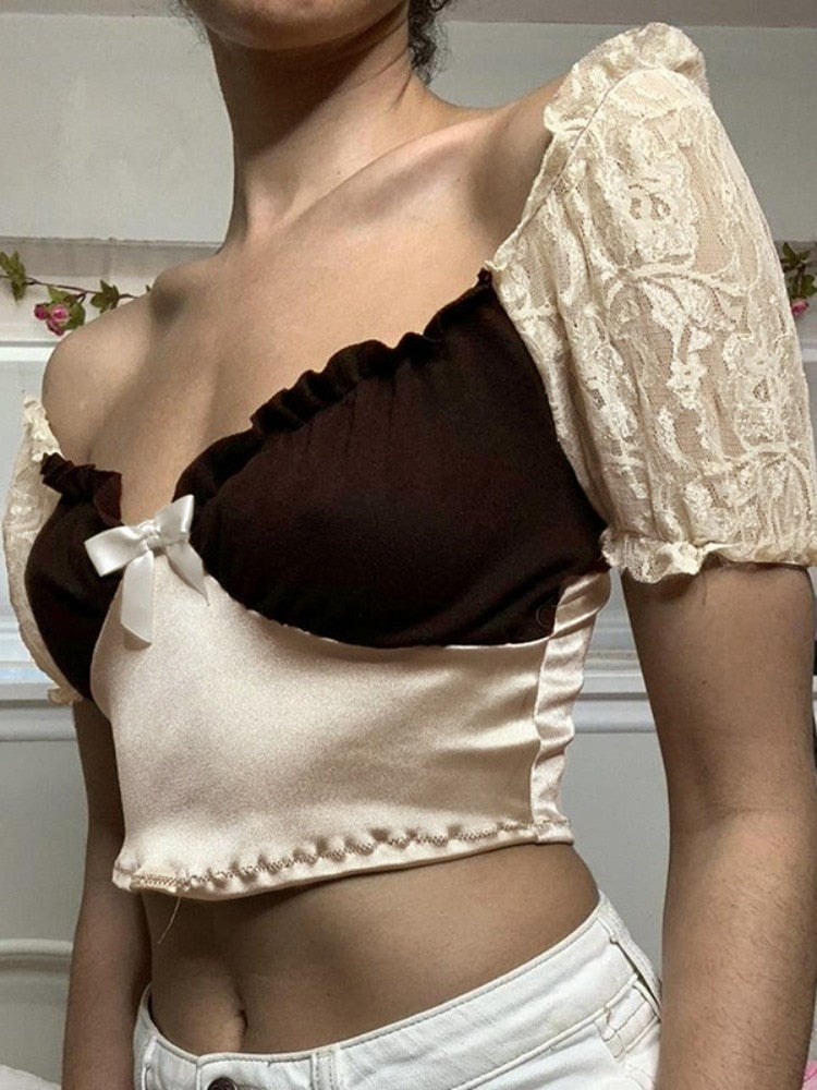 Lizakosht Tee Shirt Femmes Crop Tops V-neck Backless Puff Sleeves Lace Top Womens Tops and Blouses Summer Clothes Fashion T Shirt