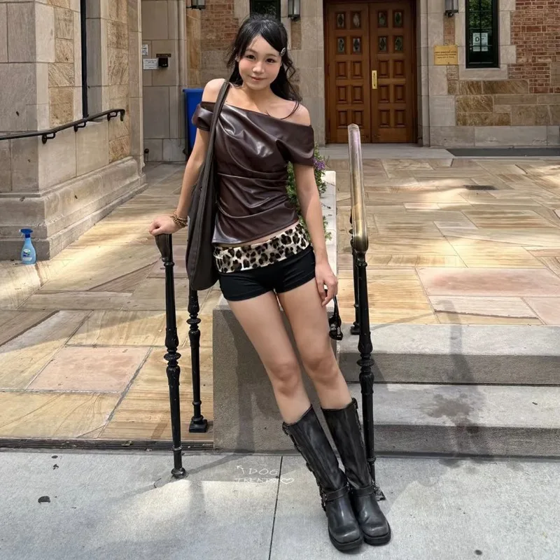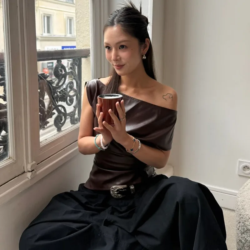 LIZAKOSHT - The 2025 Summer New Women's Irregular Leather Top Y2k High-quality and Fashionable High Street Pleated Cinched Waist Casual Vest