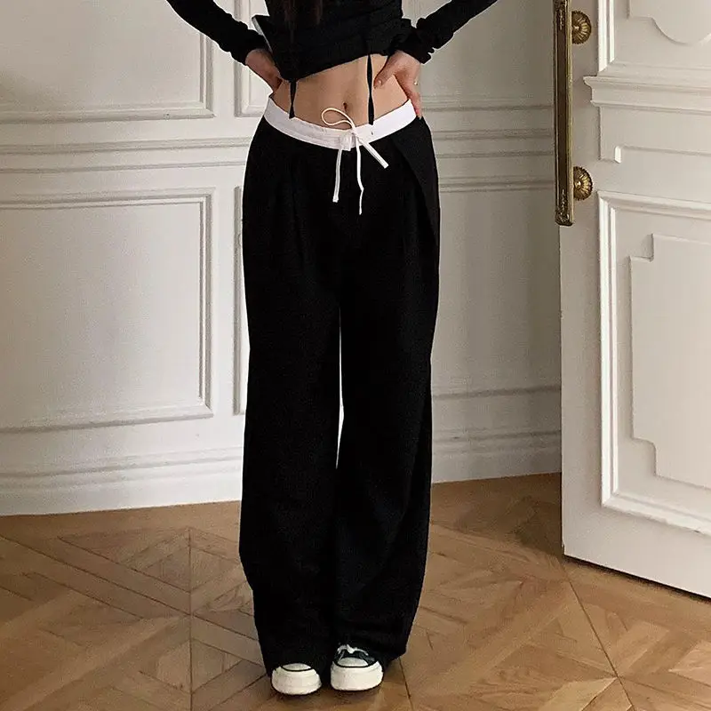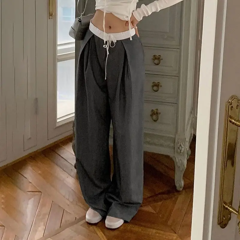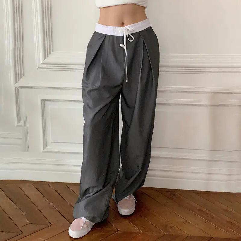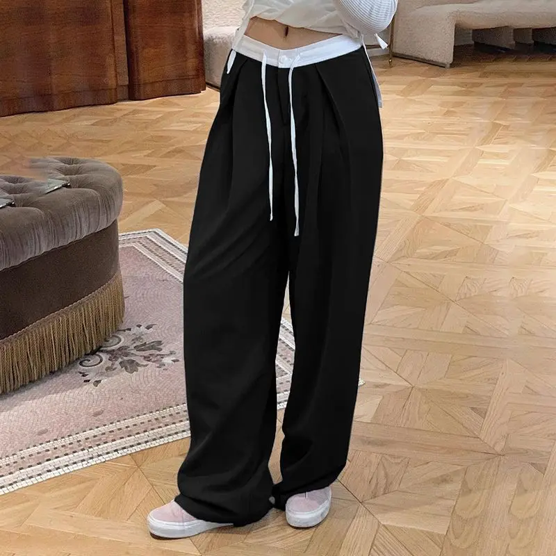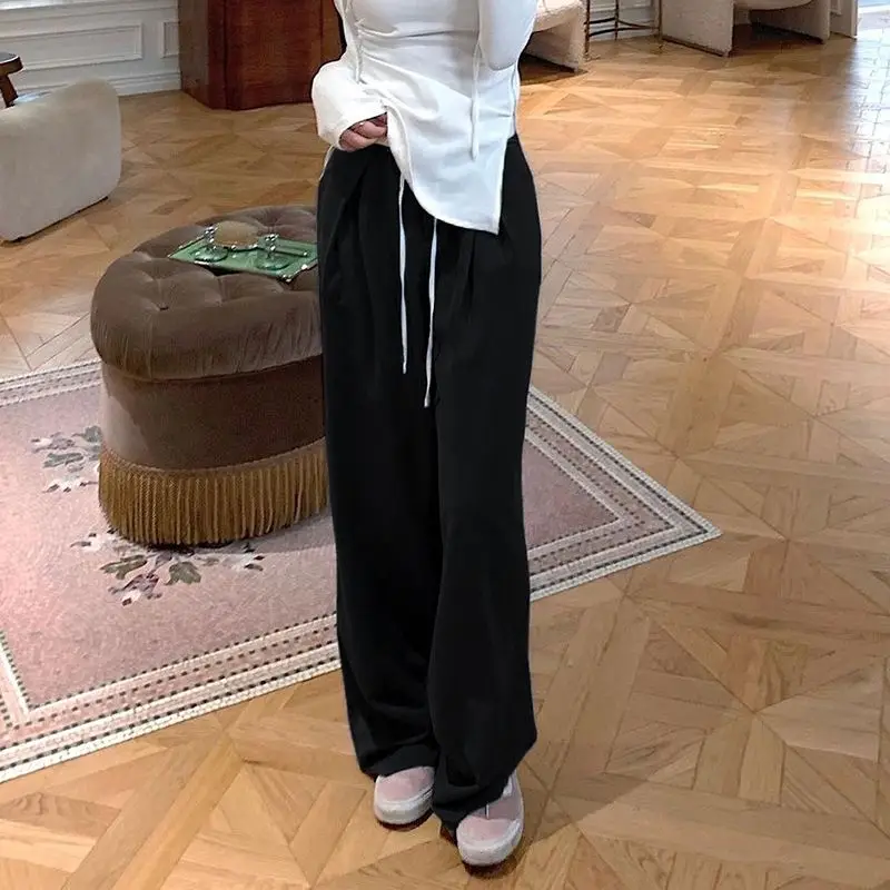 LIZAKOSHT - Trousers Fold Assorted Colors Frenulum Pants Concise Lace Up Shirring Women Casual All-Match Loose Straight Slacks Street Style