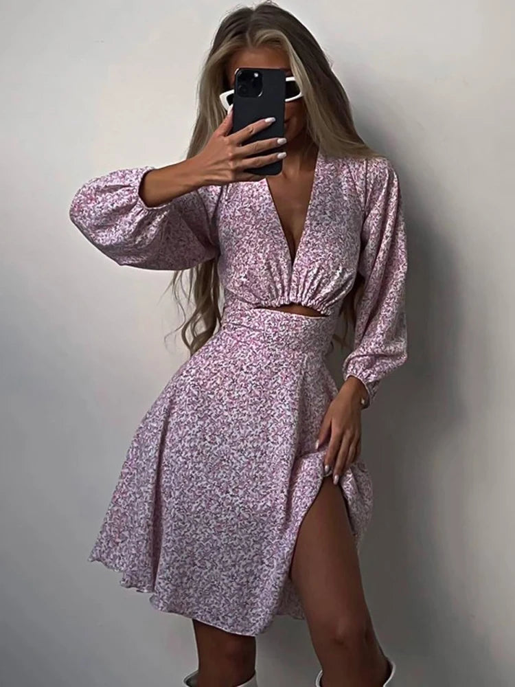 LIZAKOSHT - V-Neck Printed Mini Dress For Women Summer 2023 Fashion Hollow Out Elegant Long Sleeve Dress Outfits Patchwork Slin Dress