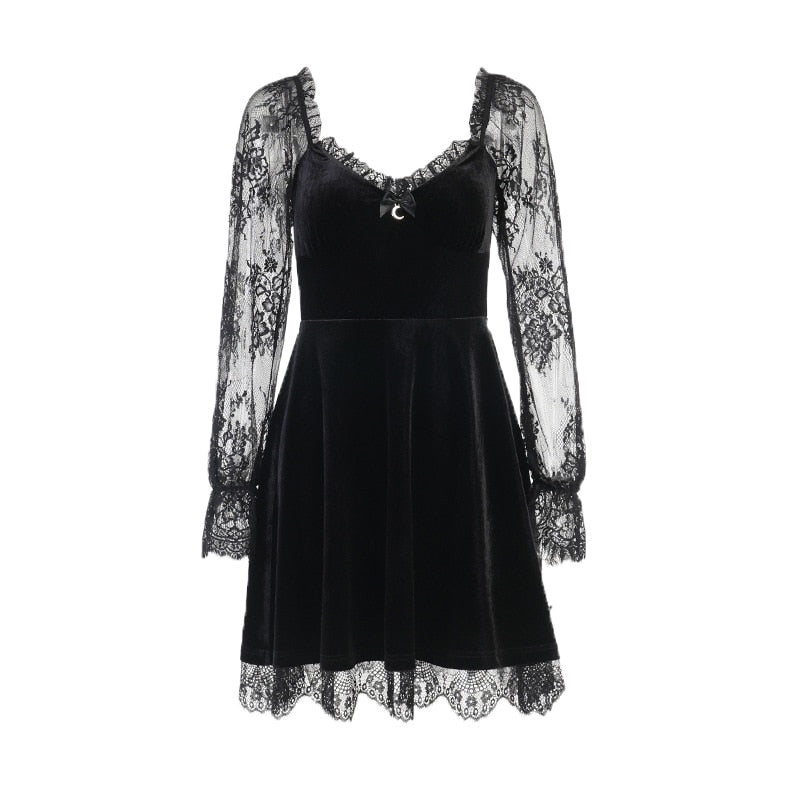 Lizakosht Velvet Women's Lace Patchwork Grunge Black Dress Long Sleeve Gothic Aesthetic Vintage Dresses A-line Autumn Partywear