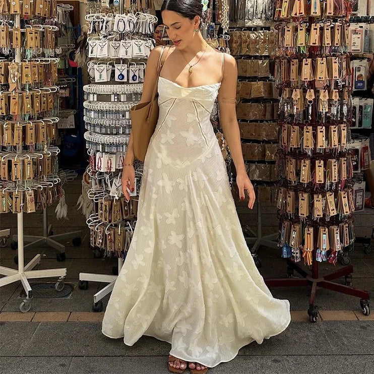 LIZAKOSHT - Vintage Floral Burn-out Strap Dress for Women Robe Back Lace Up Sexy Backless Sleeveless Slim Long Dresses Party Summer