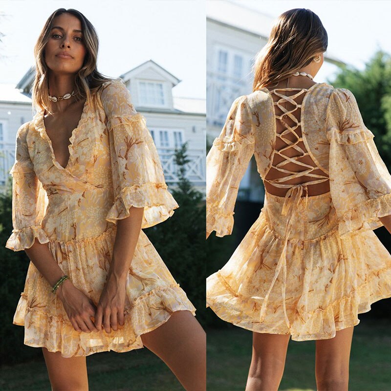 Lizakosht Vintage Floral print short dress women Sexy v neck flare sleeve boho dress Back lace up dresses Elegant chiffon vestidos A-line