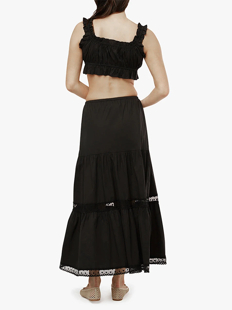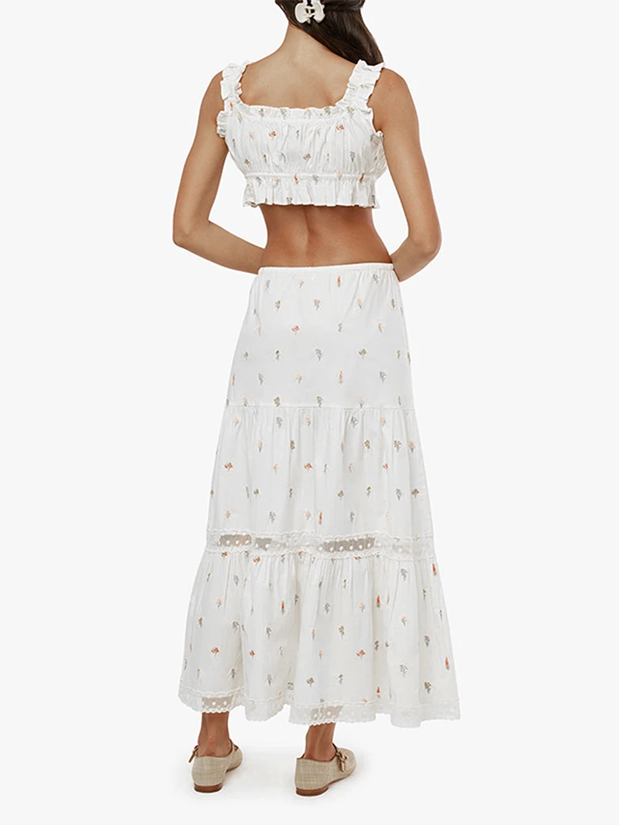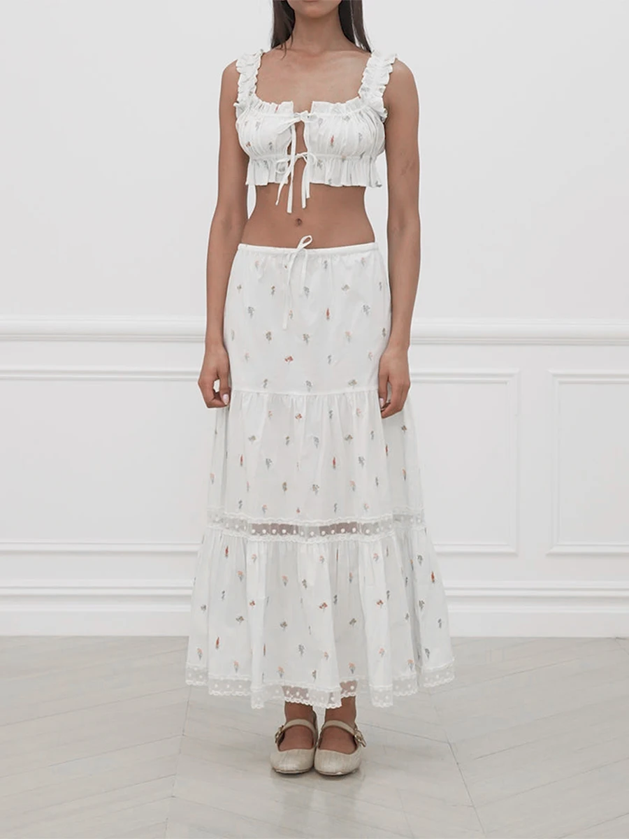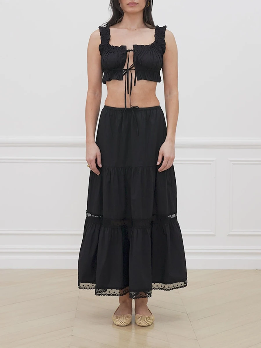 LIZAKOSHT - Vintage Frill Strap Front Tie Up Crop Tops + Maxi A-line Skirt Elegant Women Chic 2 Piece Set Fairy Y2K Matching Outfits