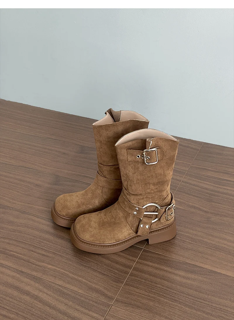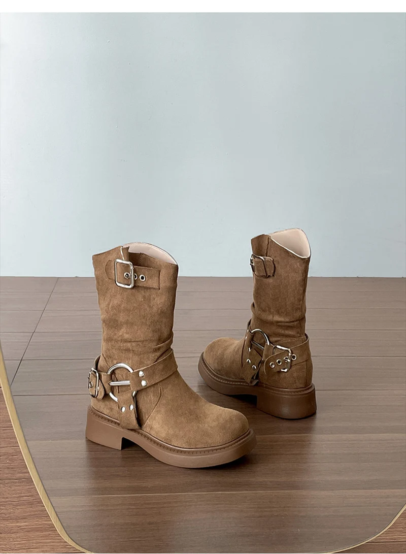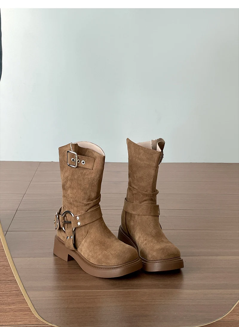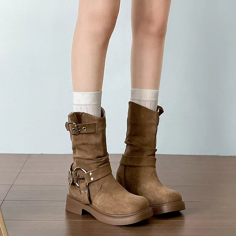 LIZAKOSHT - Vintage Low Heel Women Ankle Boots Fashion Belt Buckle Shoes Autumn Winter Short Booties Zapatos De Mujer