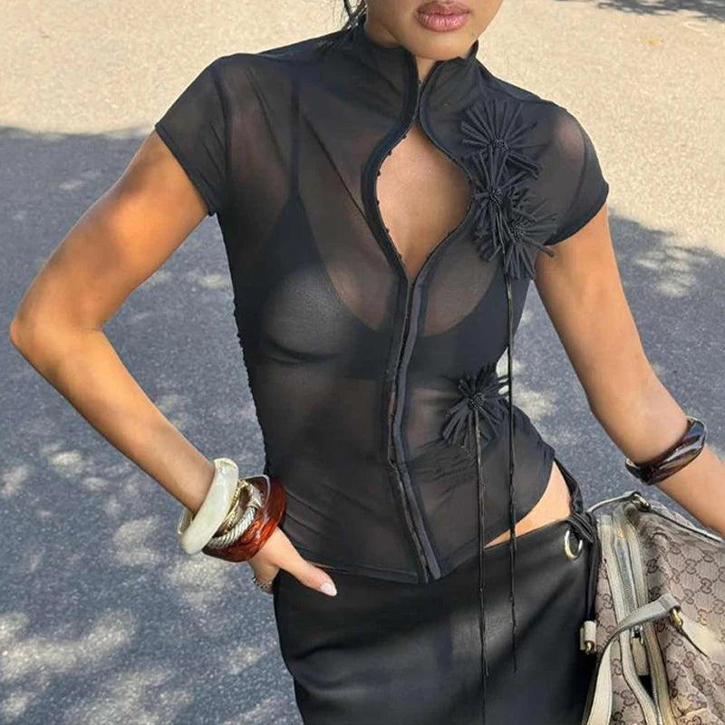 LIZAKOSHT - Vintage Sexy Single Breasted 3D Flower See-through Half High Collar Short-sleeved T Shirt Party Street Casual Slim Fit Tops