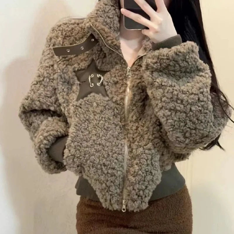 LIZAKOSHT - Vintage Star Patchwork Fluffy Women Coats Fashion Y2k Aesthetic Double Zippers Jackets New Winter Grunge Casual Loose Crop Coat