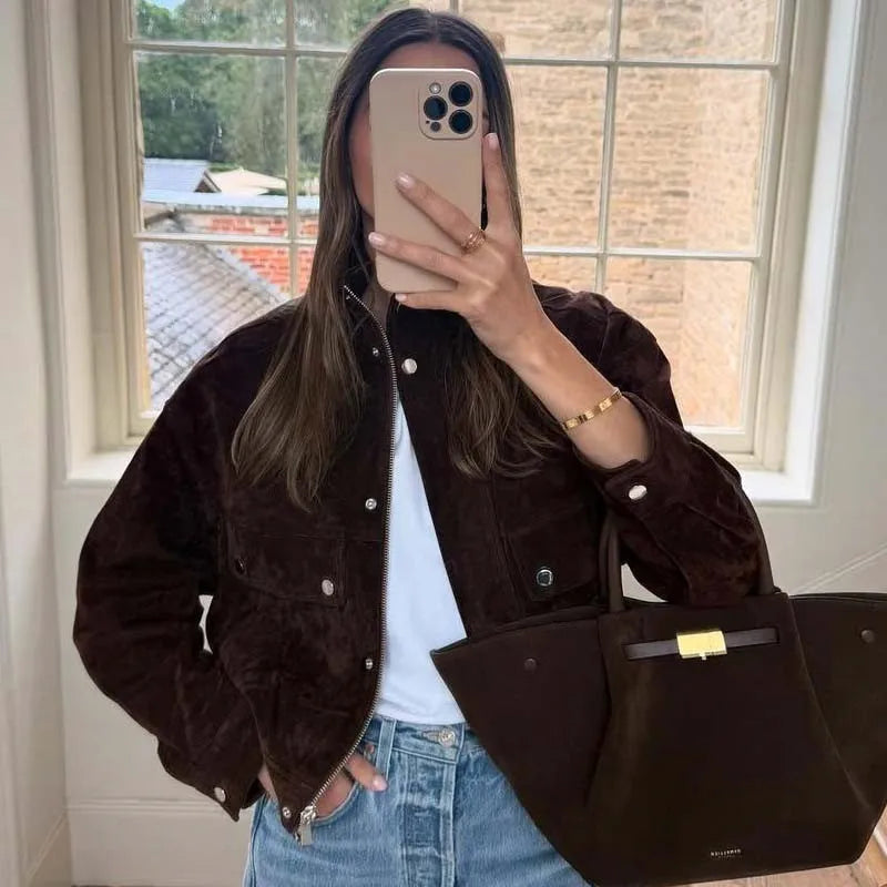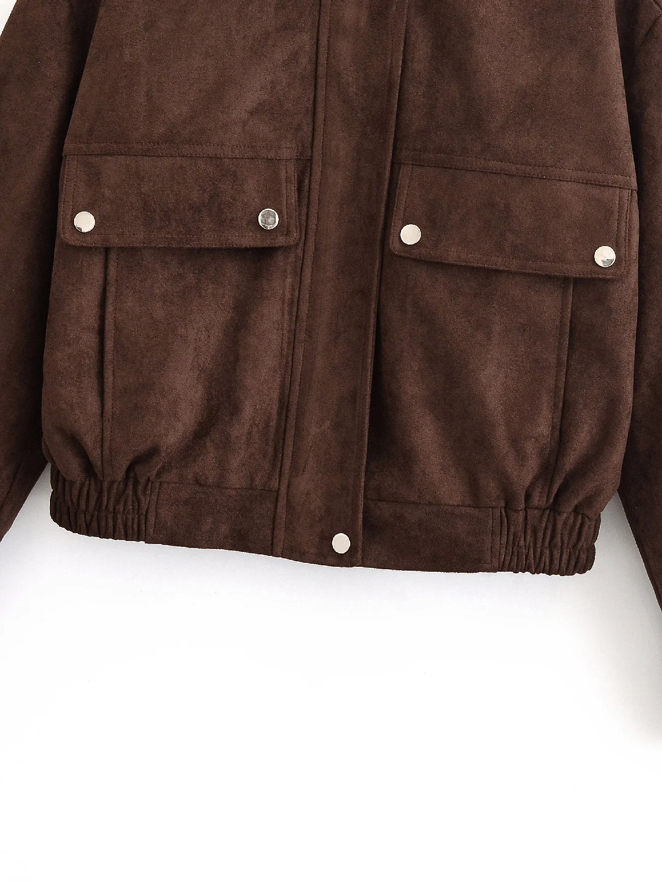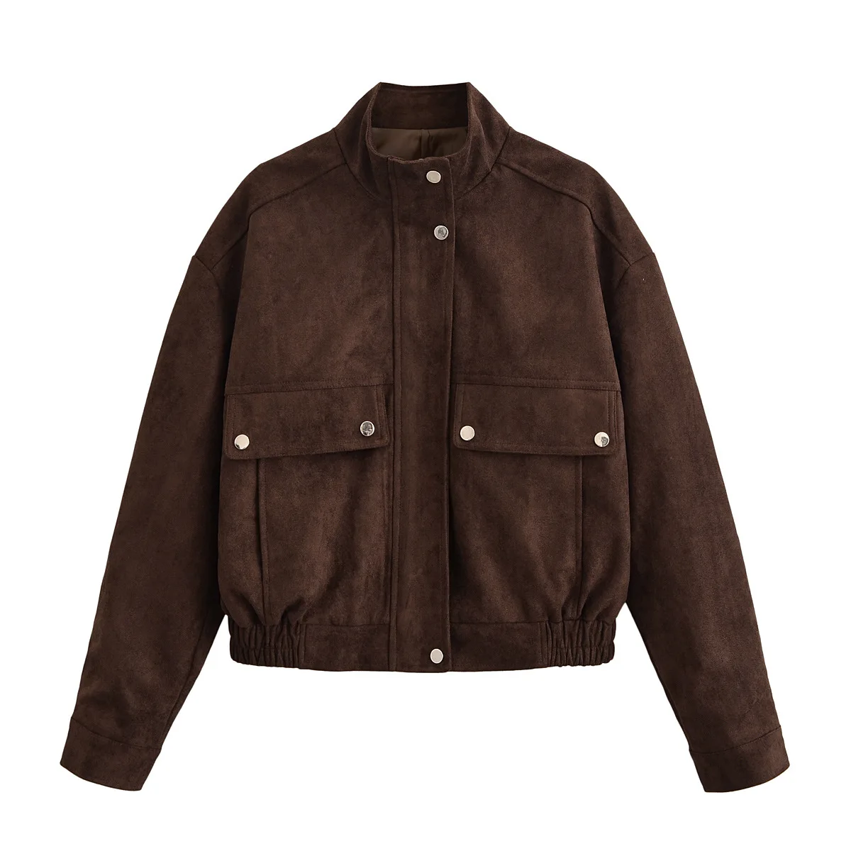 LIZAKOSHT - Vintage Suede Bomber Jacket For Women Brown Short Coat High Collar Long Sleeves With Pockets Overcoat New Autumn Winter