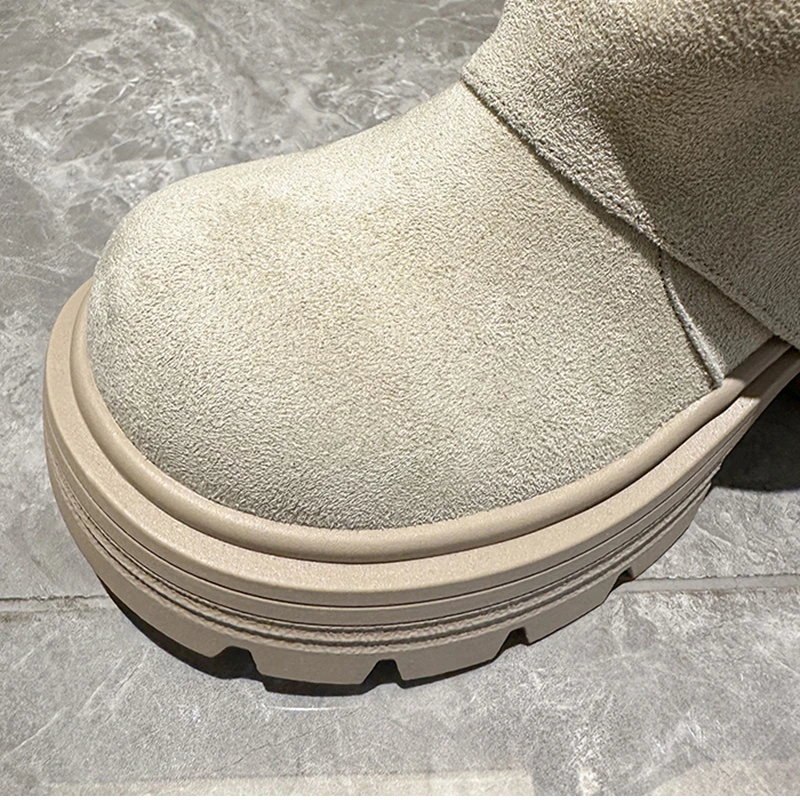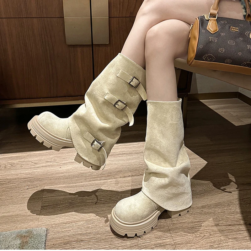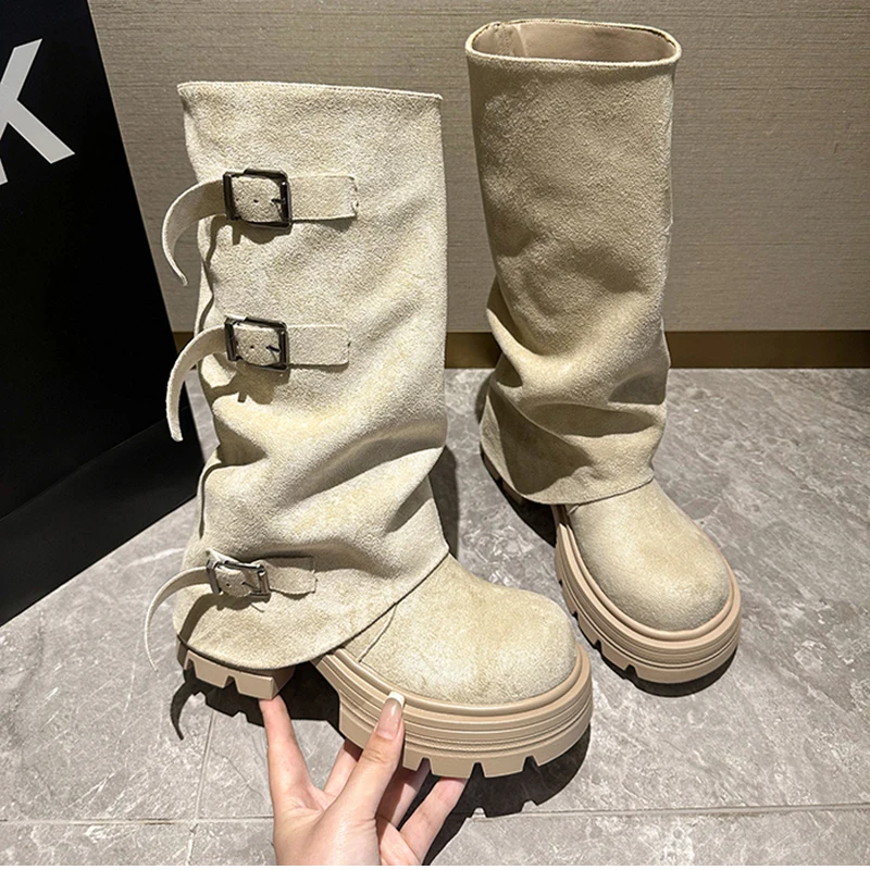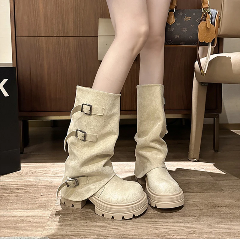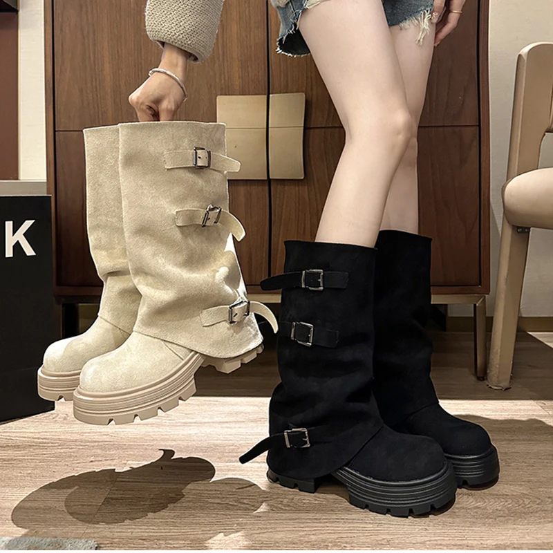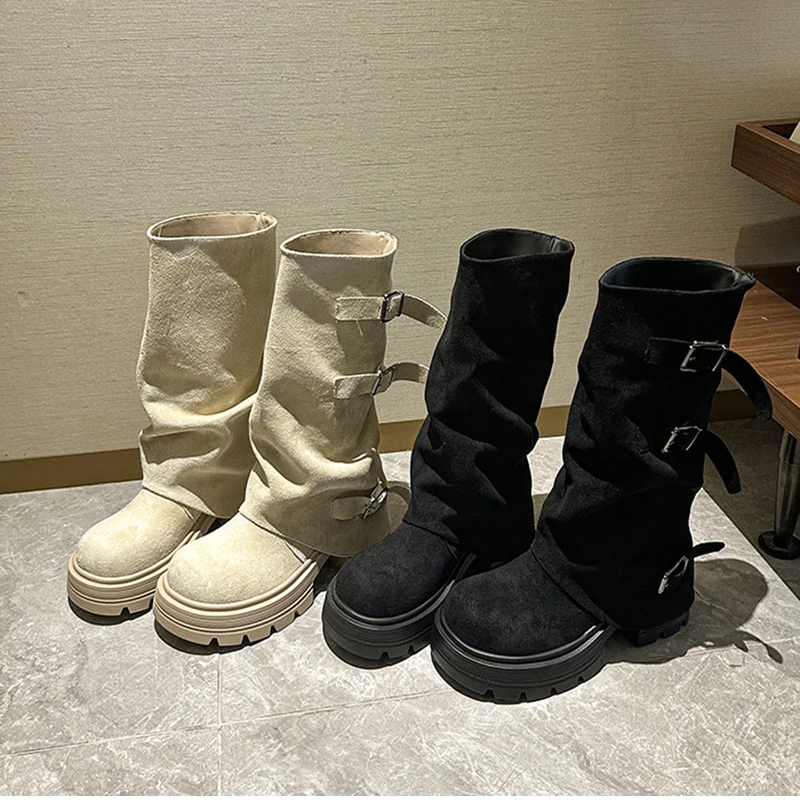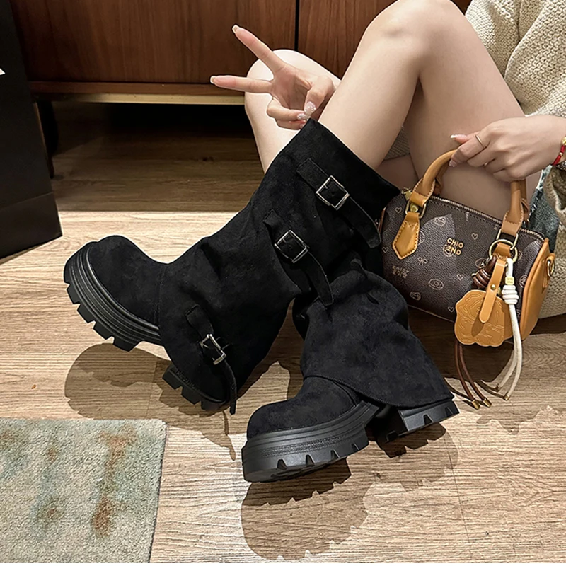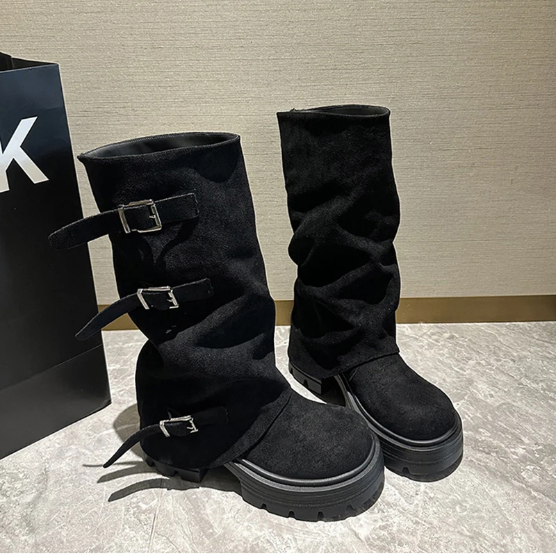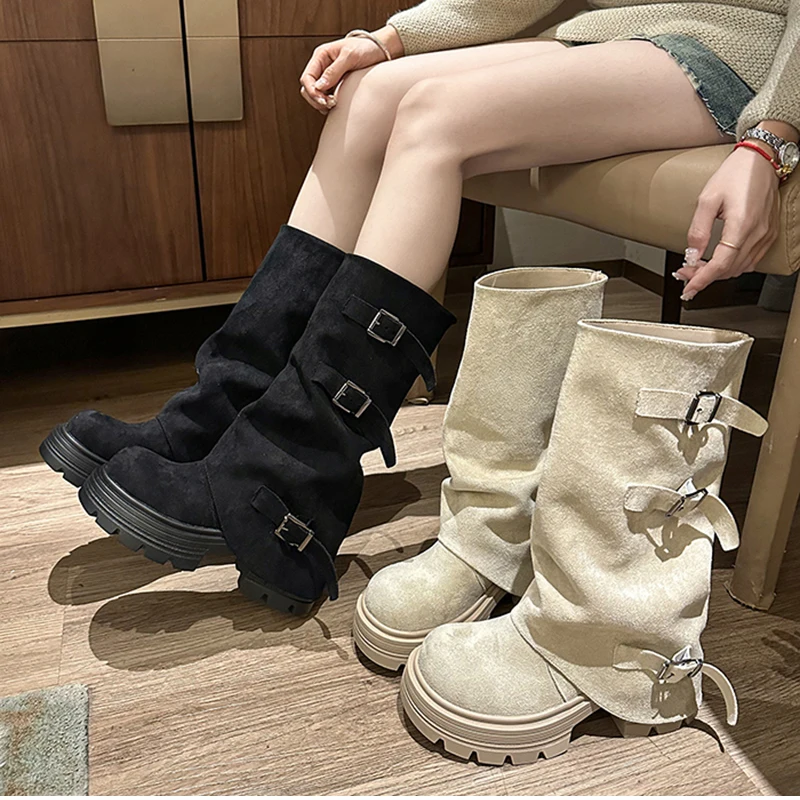 LIZAKOSHT - Winter Fashion Platform Thick Heel Woman Knight Boots Fashion Belt Buckle Slip On Mid Calf Booties