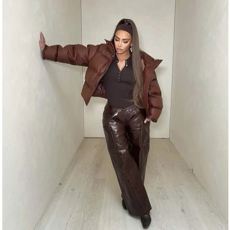 Lizakosht Winter New Women PU Leather Cotton Coat Zipper Stand Collar Short Coat Cotton-padded Jacket Brown Streetwear Casual Ladies