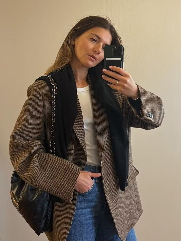 Lizakosht Woman Fashion Houndstooth Blazers Coats Female Long Sleeve with Pockets Chic Blazers Ladies Loose Notched Collar Coats