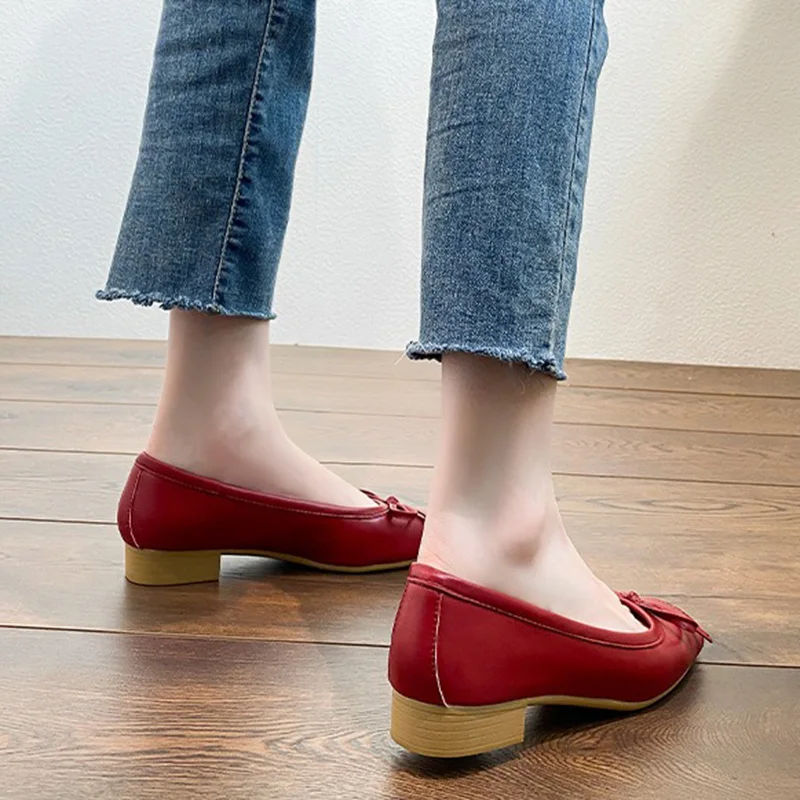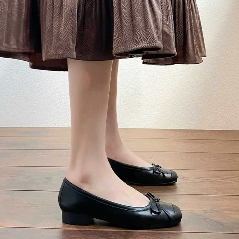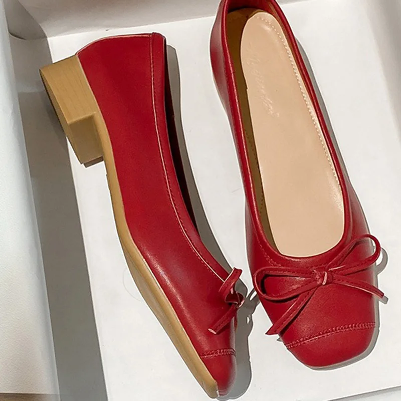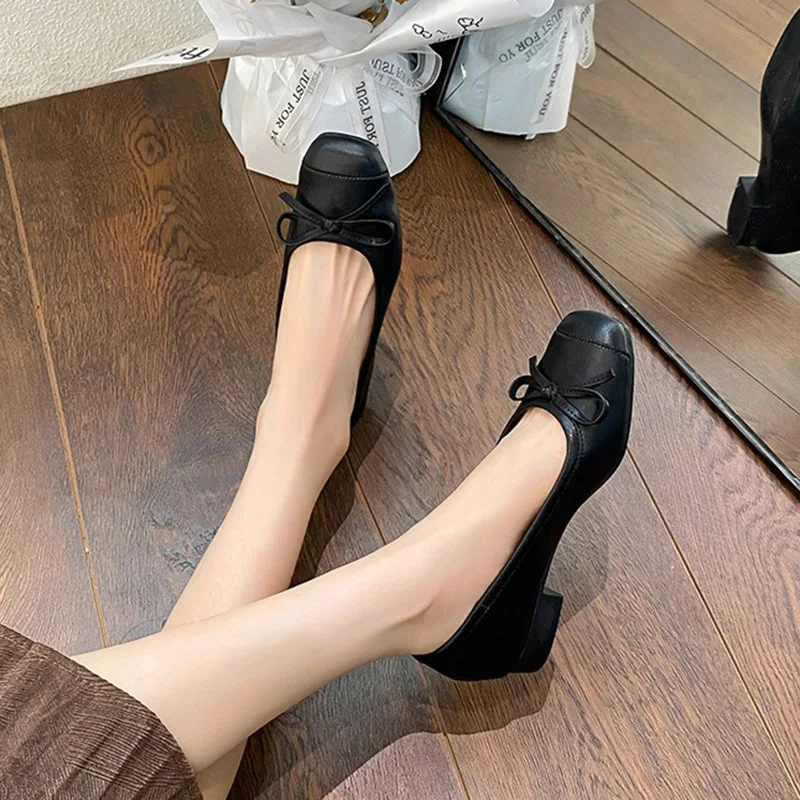 LIZAKOSHT - Women 3.5cm High Heels Comfortable Genuine Leather Shoes Lady Sweet Valentine Shoes Female French Style Butterfly Knots Pumps