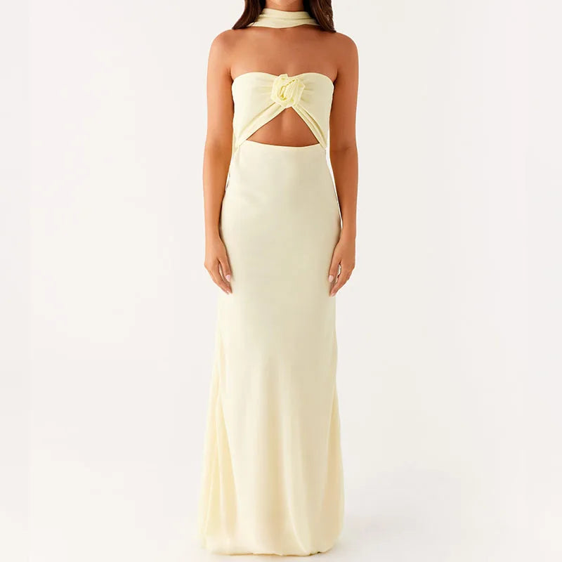 LIZAKOSHT - Women 3D Floral Tube Strapless Maxi Bodycon Dress with Scarf Sexy Club Party Y2k Summer Backless Mesh Long Dresses