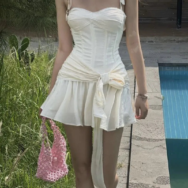 LIZAKOSHT - Women Bow Sashes Party Skater Short Sling Robe Vestido Sexy Beige Ruched Bra Corset style Halter Leaves Tassel Mini Dress