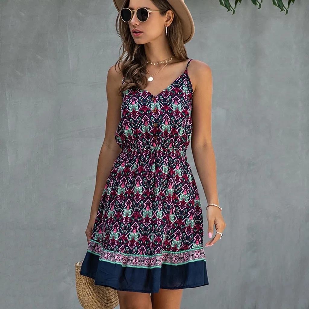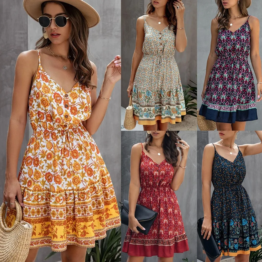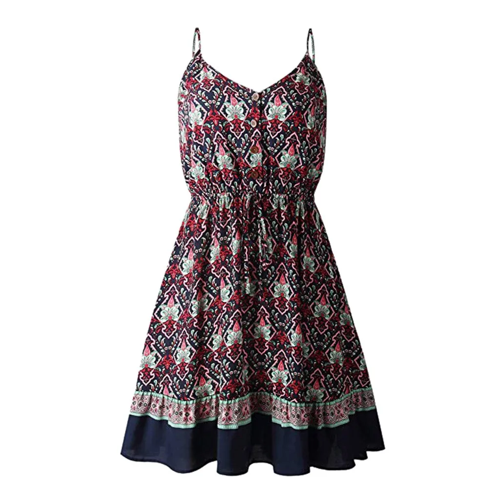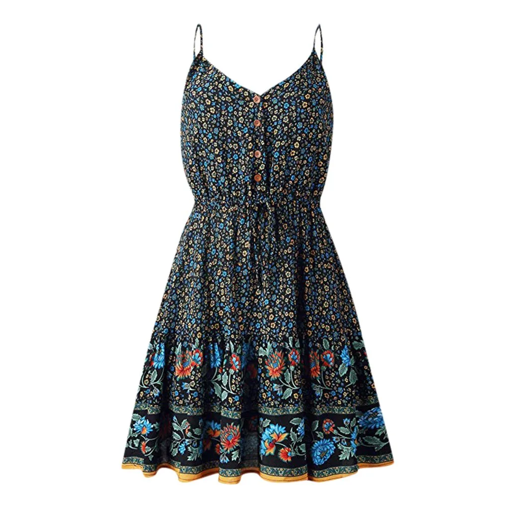 LIZAKOSHT - Women Casual Floral Strap V-neck Sexy Backless Dresses New Summer Female Sling Boho Sleeveless Elegant Evening Party Beach Dress