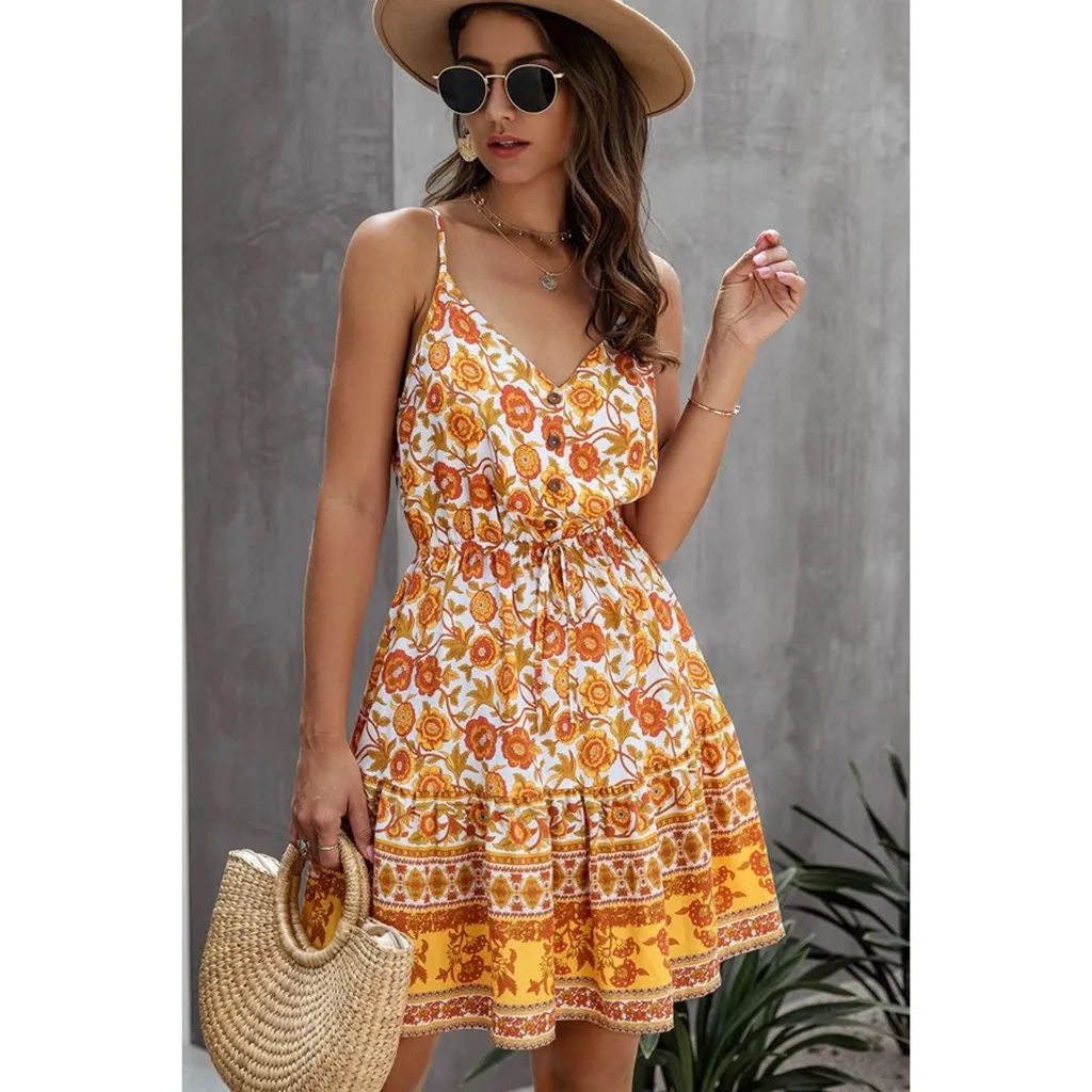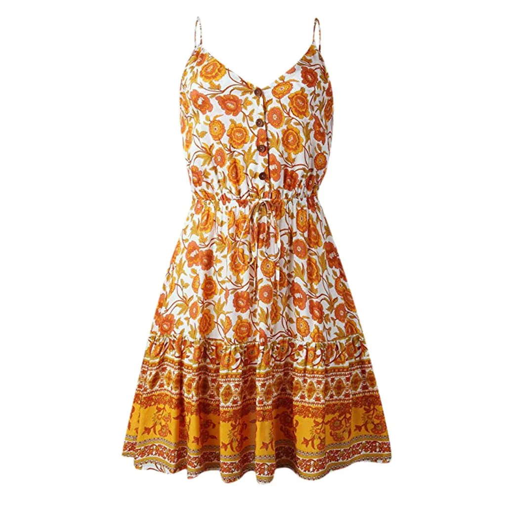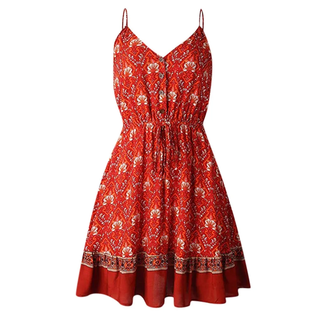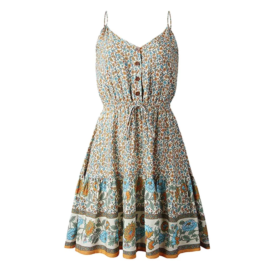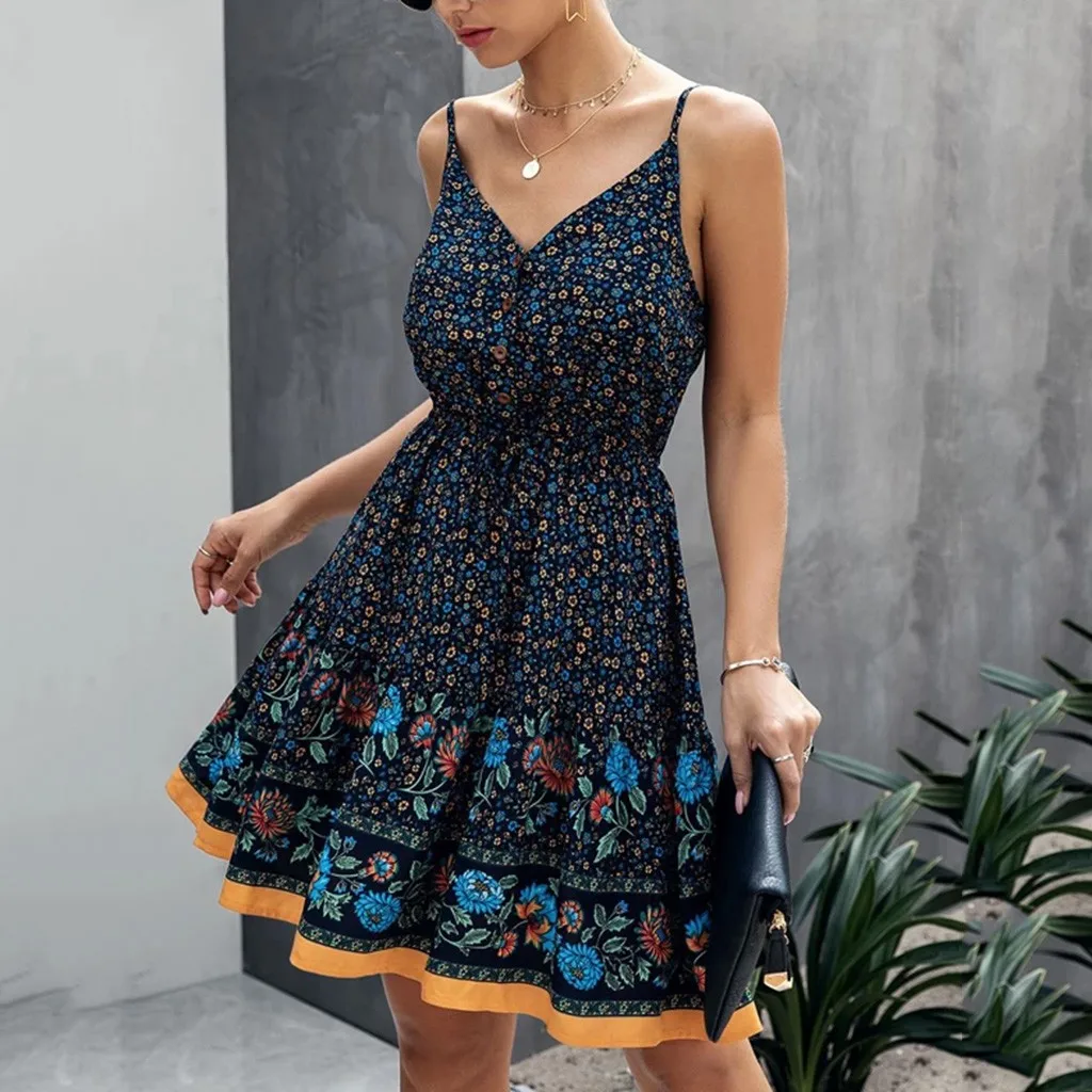 LIZAKOSHT - Women Casual Floral Strap V-neck Sexy Backless Dresses New Summer Female Sling Boho Sleeveless Elegant Evening Party Beach Dress
