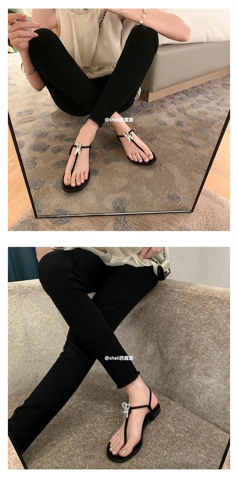 LIZAKOSHT - Women Concise Elegant Leisure Bow Crystal Sandals Round Toe Flat Heels Med Heels Leather Sandals Back Strap Black Shoes