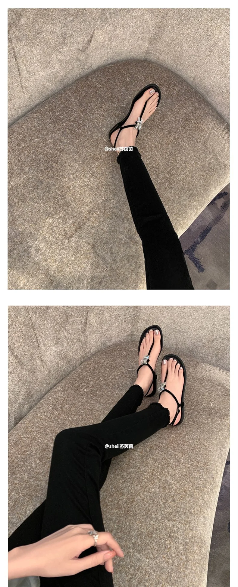 LIZAKOSHT  -  Women Concise Elegant Leisure Bow Crystal Sandals Round Toe Flat Heels Med Heels Leather Sandals Back Strap Black Shoes