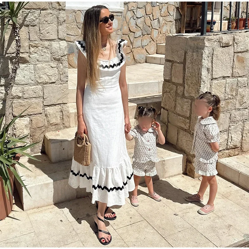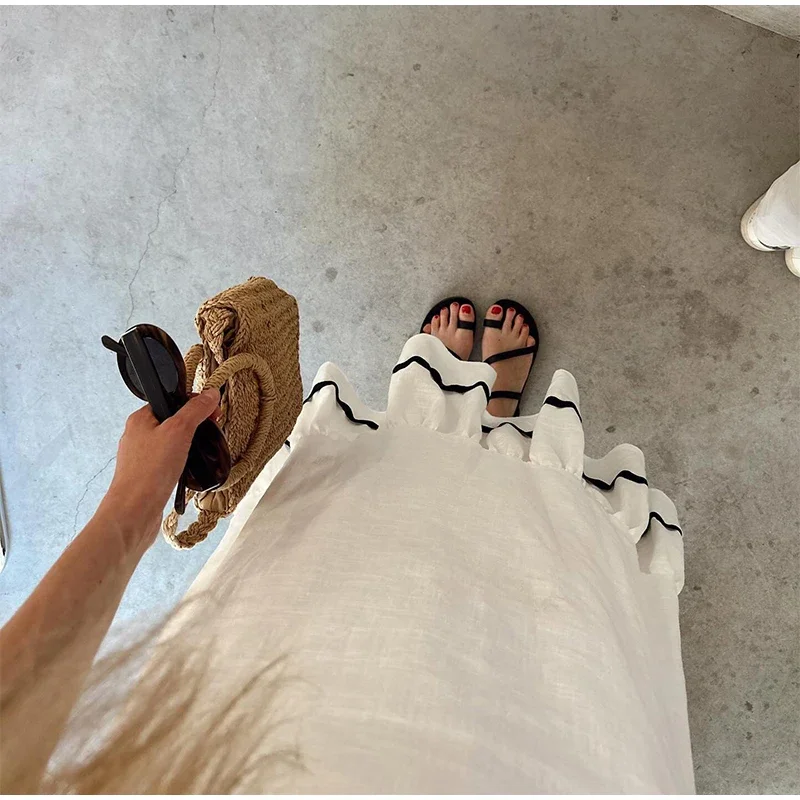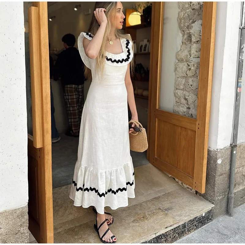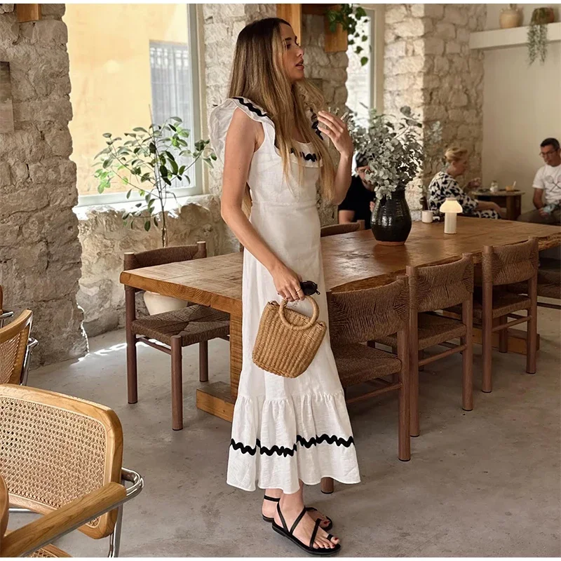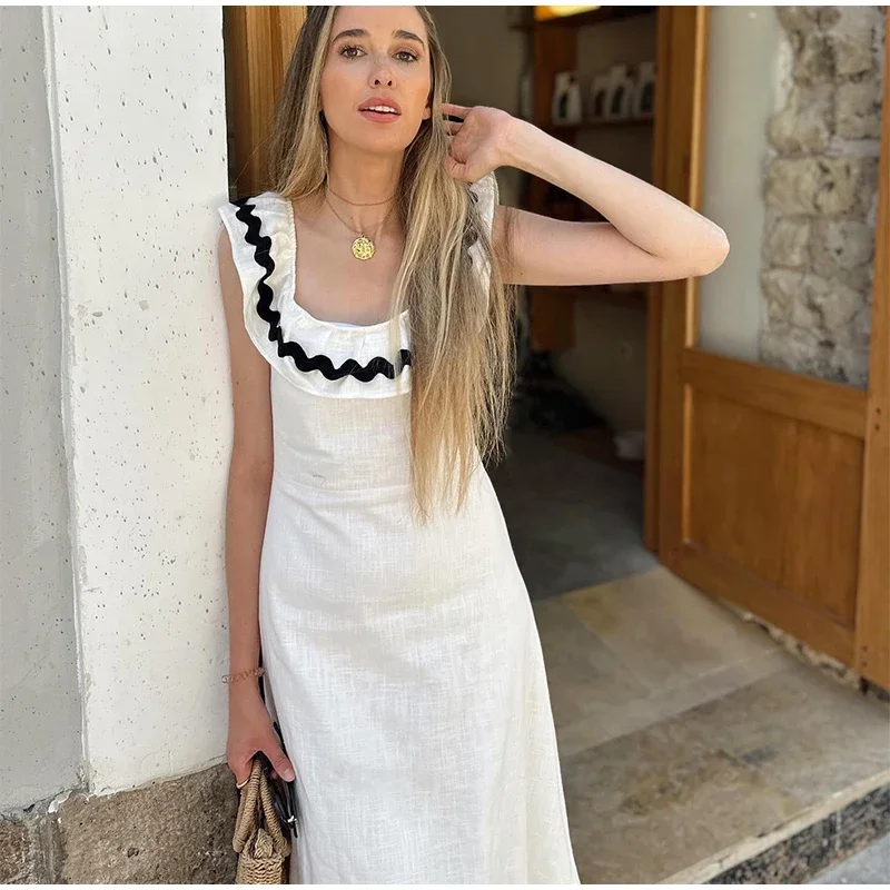 LIZAKOSHT - Women Elegant Contrast Spliced Ruffles Hem Long Dress Fashion Square Neck Backless Sleeveless Robes Female Chic Holiday Vestidos
