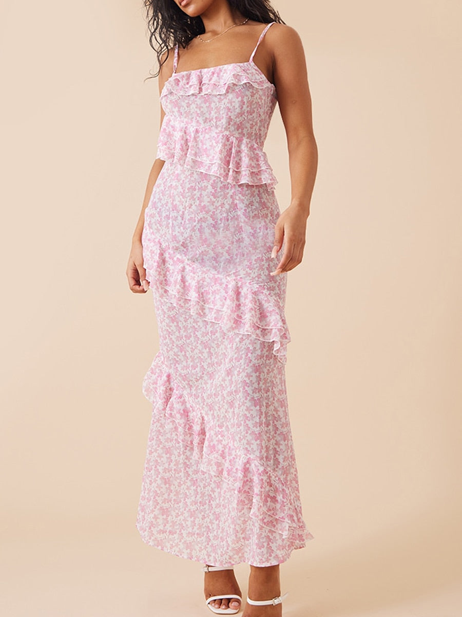 Lizakosht Women Elegant Sling Dress Sleeveless Spaghetti Straps Flower Print Ruffled Summer Long Sundress for Cocktail Party