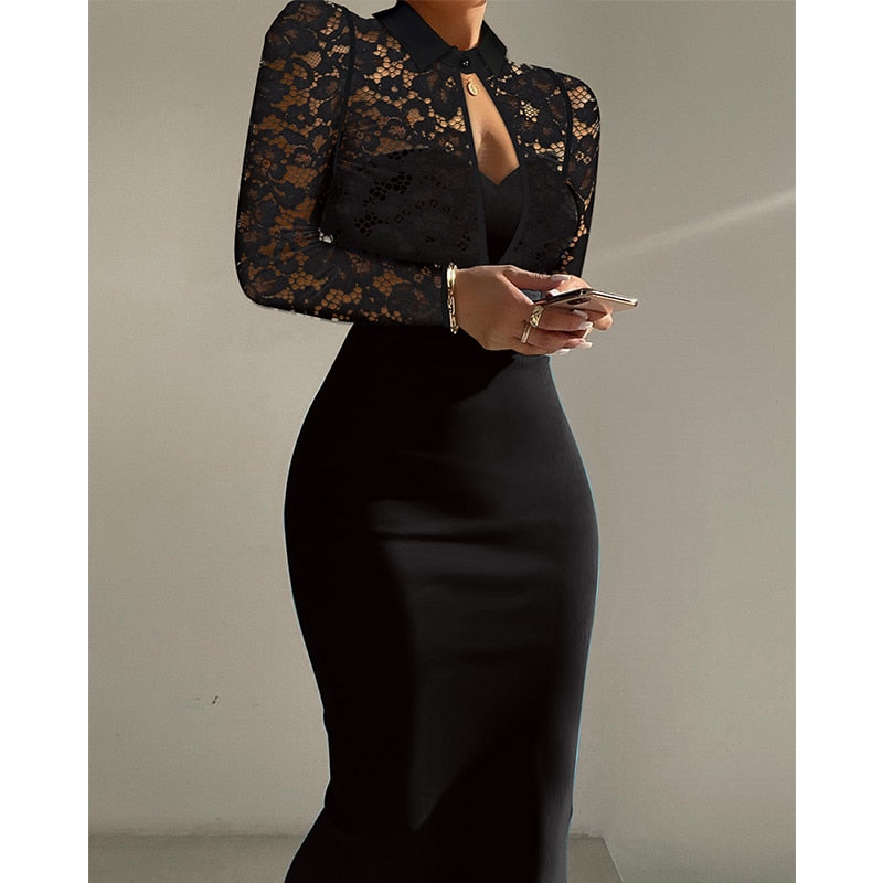 Lizakosht Women Fashion Contrast Lace Long Sleeve Cutout Bodycon Dress Black Elegant Bodycon Midi Skinny Dresses