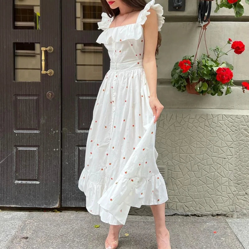 2024 Women French Front Button Strawberry Print White Sexy Elegant Dress