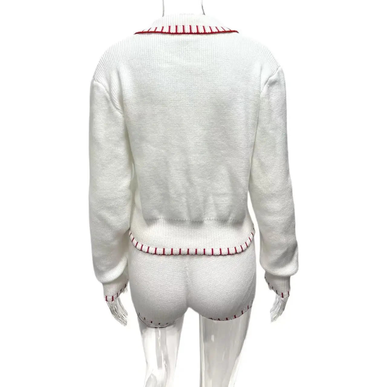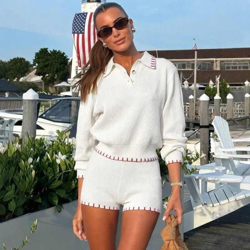 LIZAKOSHT - Women Knitted Shorts 2-Piece Set Autumn White Knitted Collared Top Slim Shorts Fashion Casual Knit Shorts Set Outfits