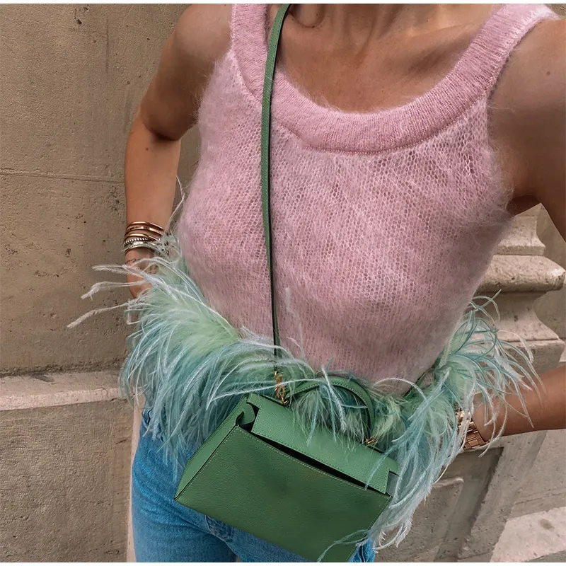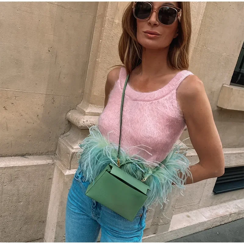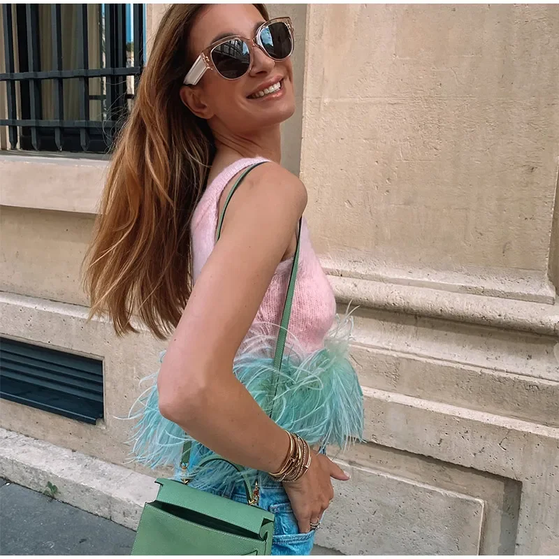 LIZAKOSHT - Women O Neck Feather Hem Knitted Vest Fashion Chic Sleeveless Sling Tank Tops 2024 Summer Female Casual High Street Pullover