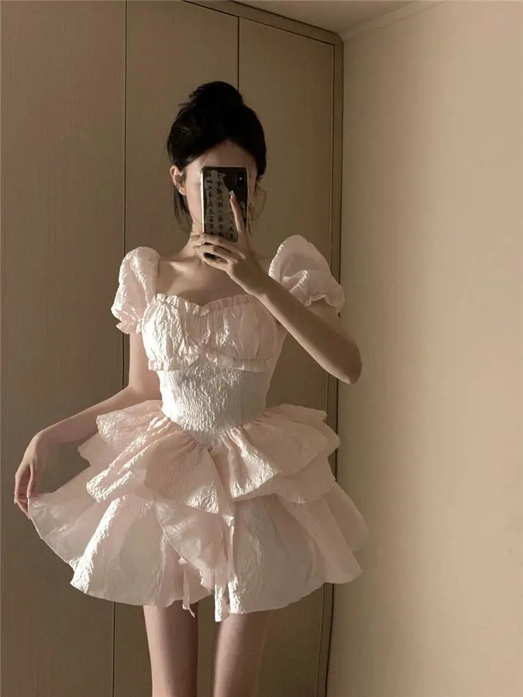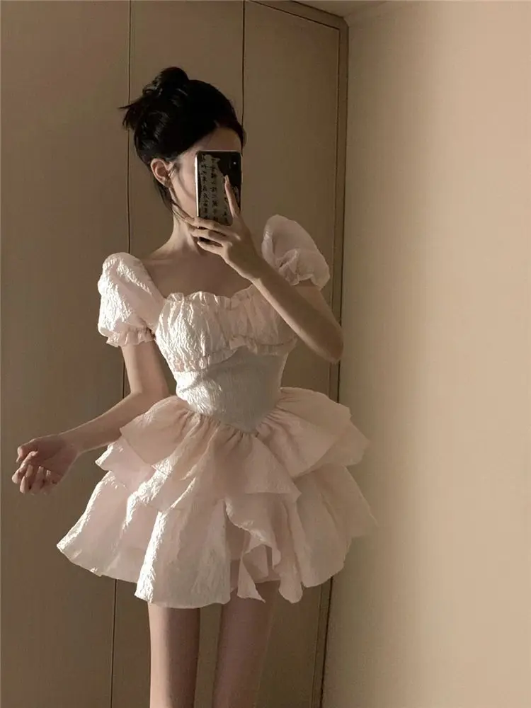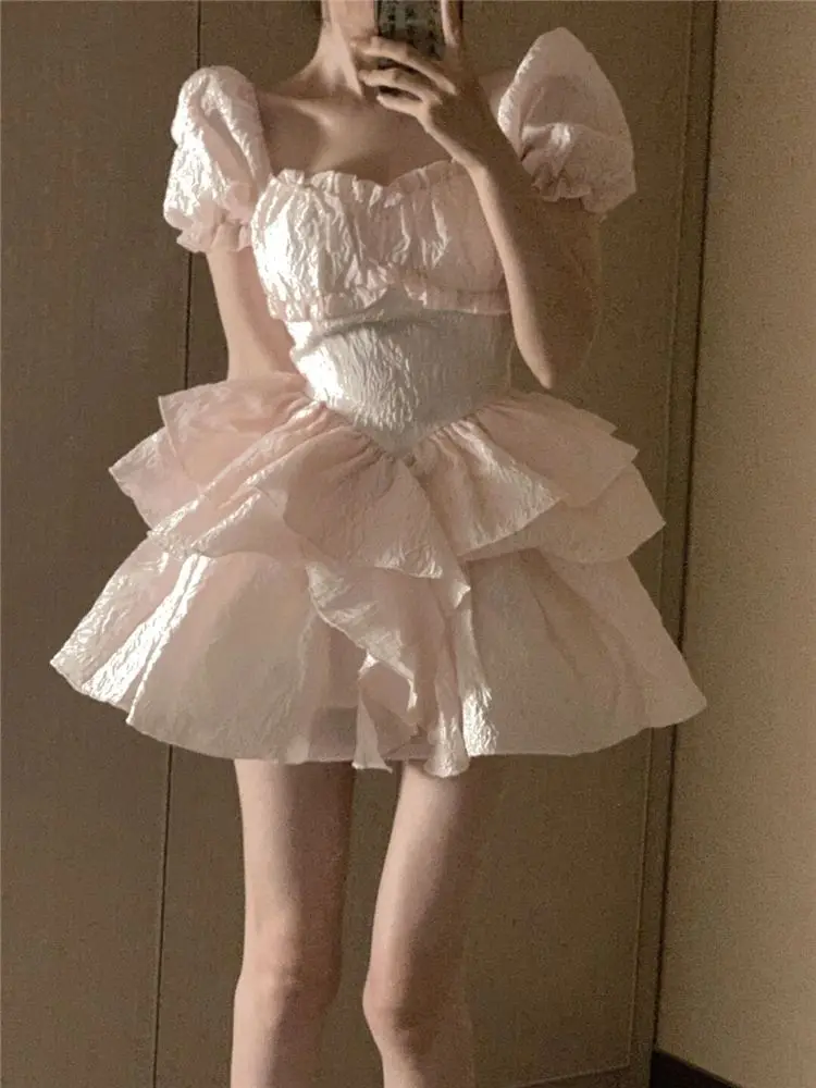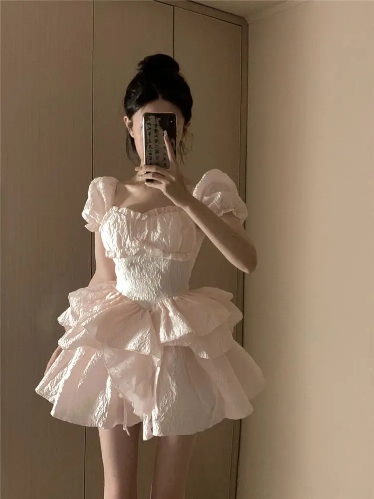 LIZAKOSHT - Women Pink Sweet Princess Dress Korean Cute Puff Sleeve Square Collar Cake Mini Dress Lady High Waist Party Dress