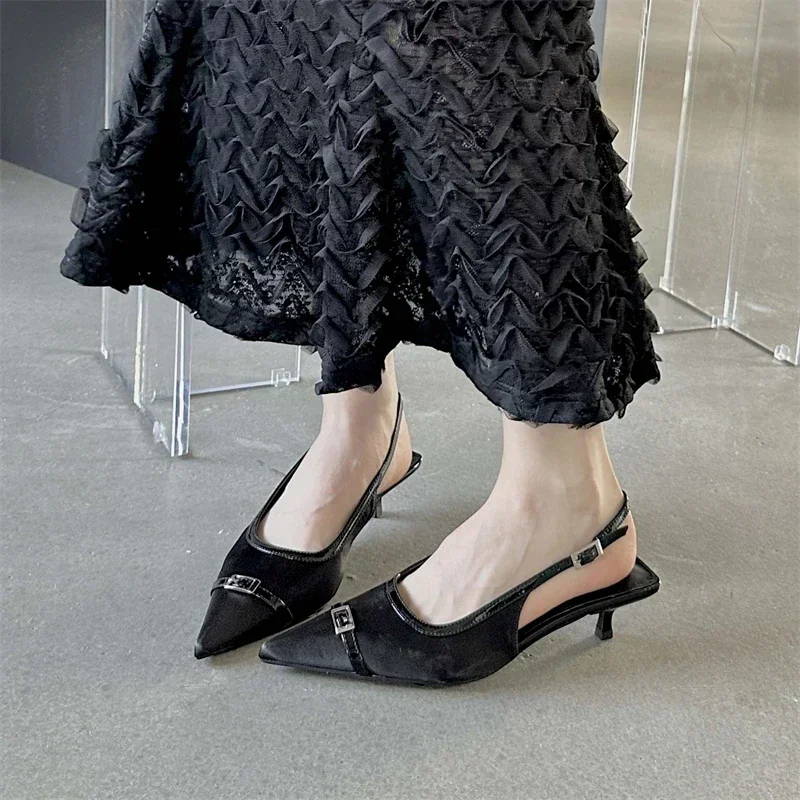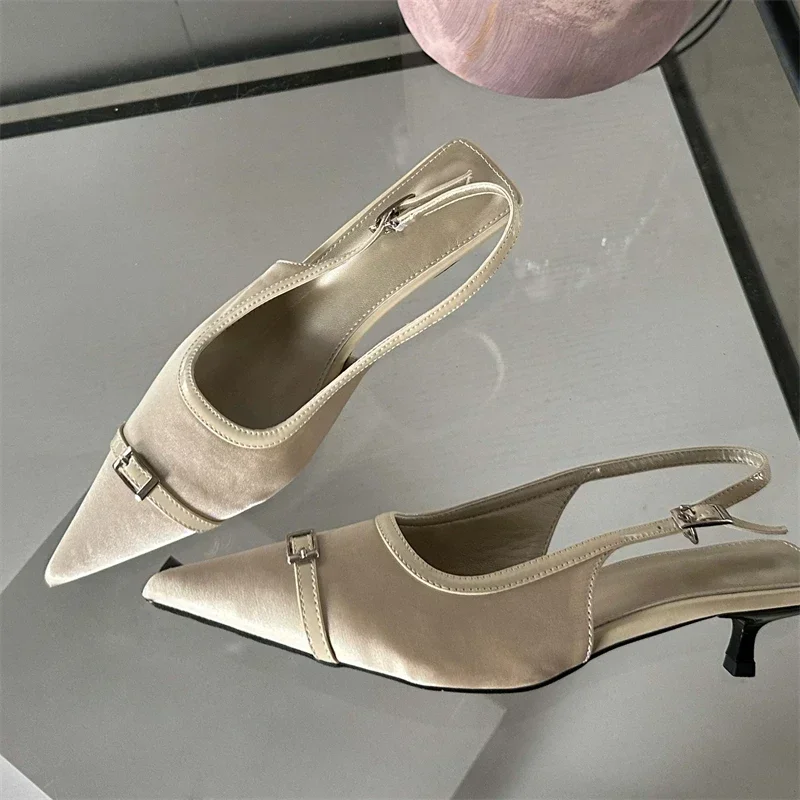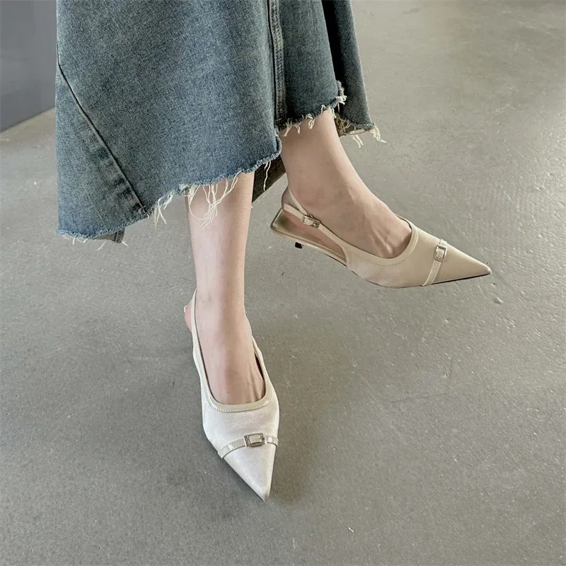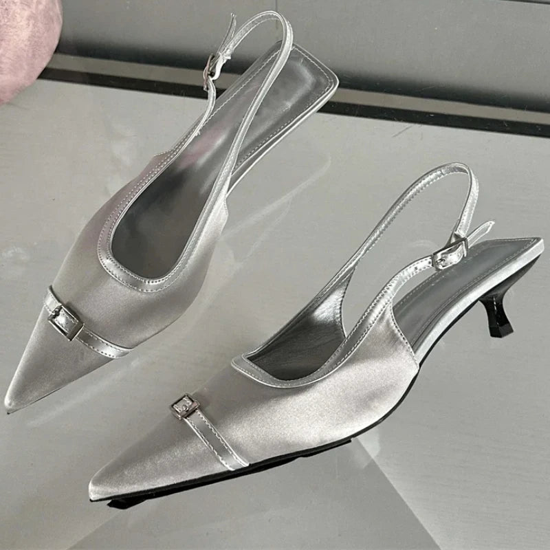 LIZAKOSHT Women Pumps Pointed Toe New Satins Slingback Sandals Ladies Buckle Fashion Design Silver Banquet Low Heels Mules Shoes for Women