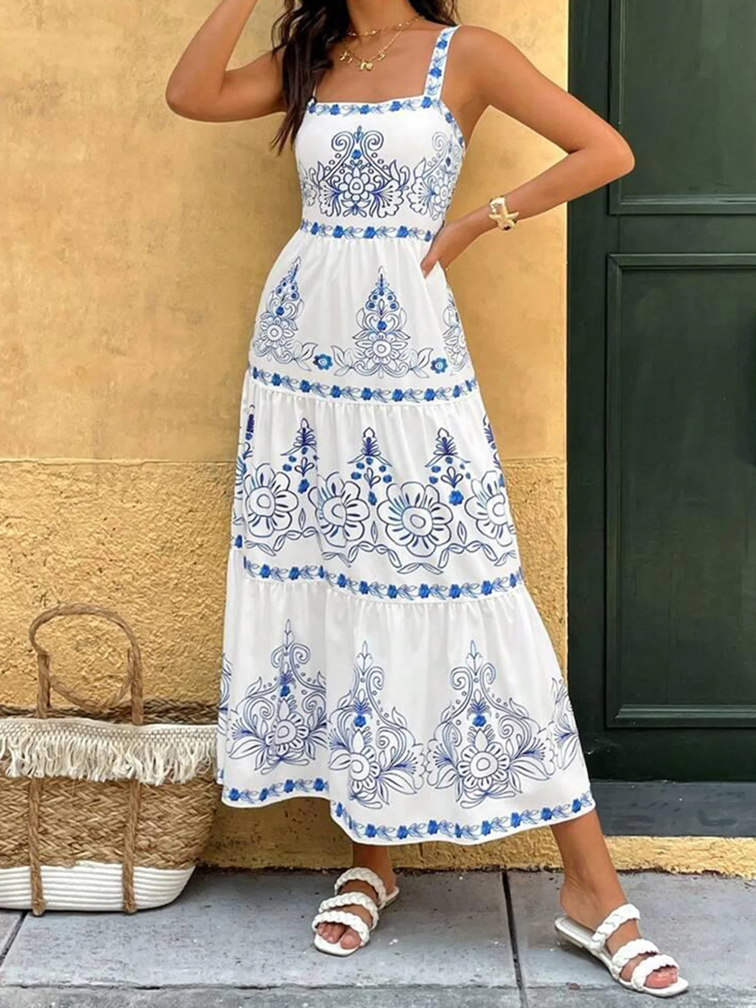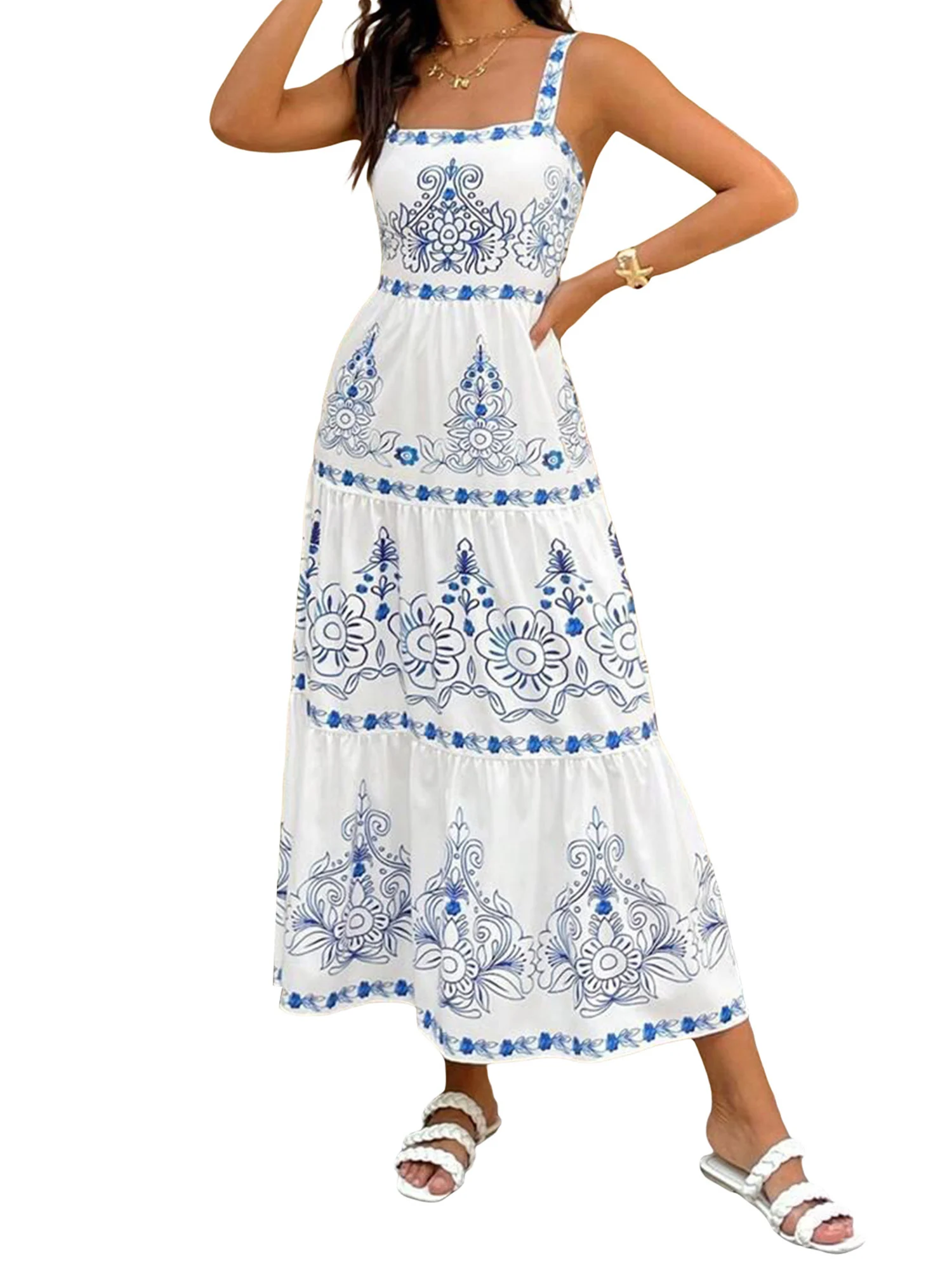 LIZAKOSHT - Women s Ruffled Maxi Dress Sleeveless Boho Floral Print A-Line Dress Summer Flowy Beach Dress with Tiered Hem