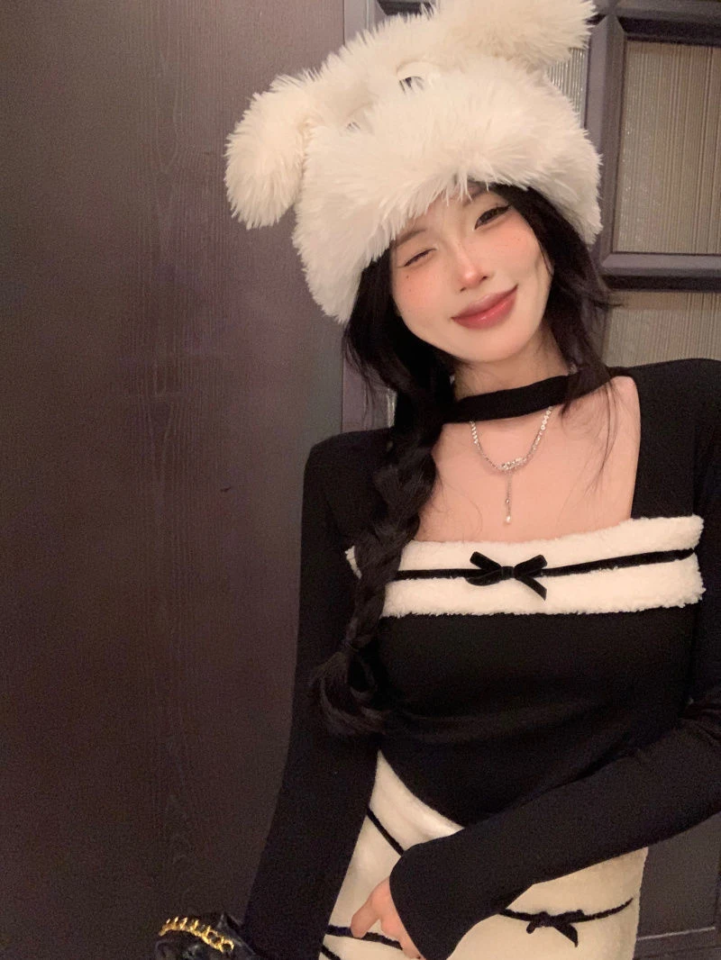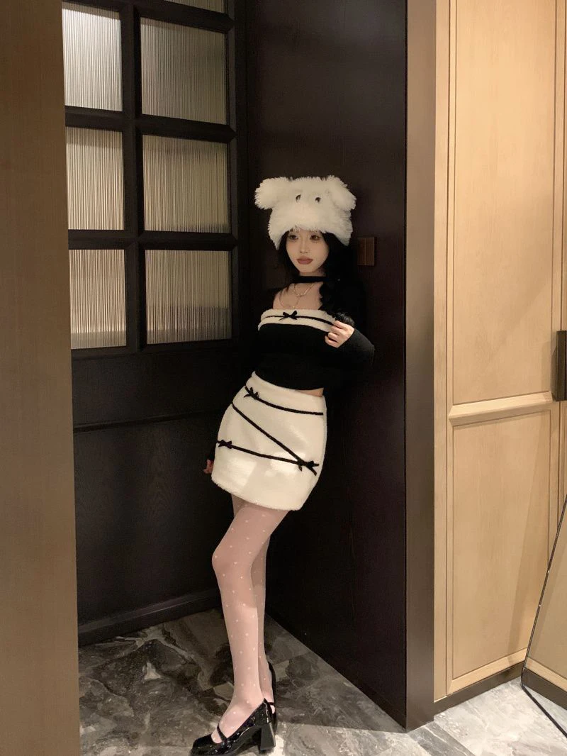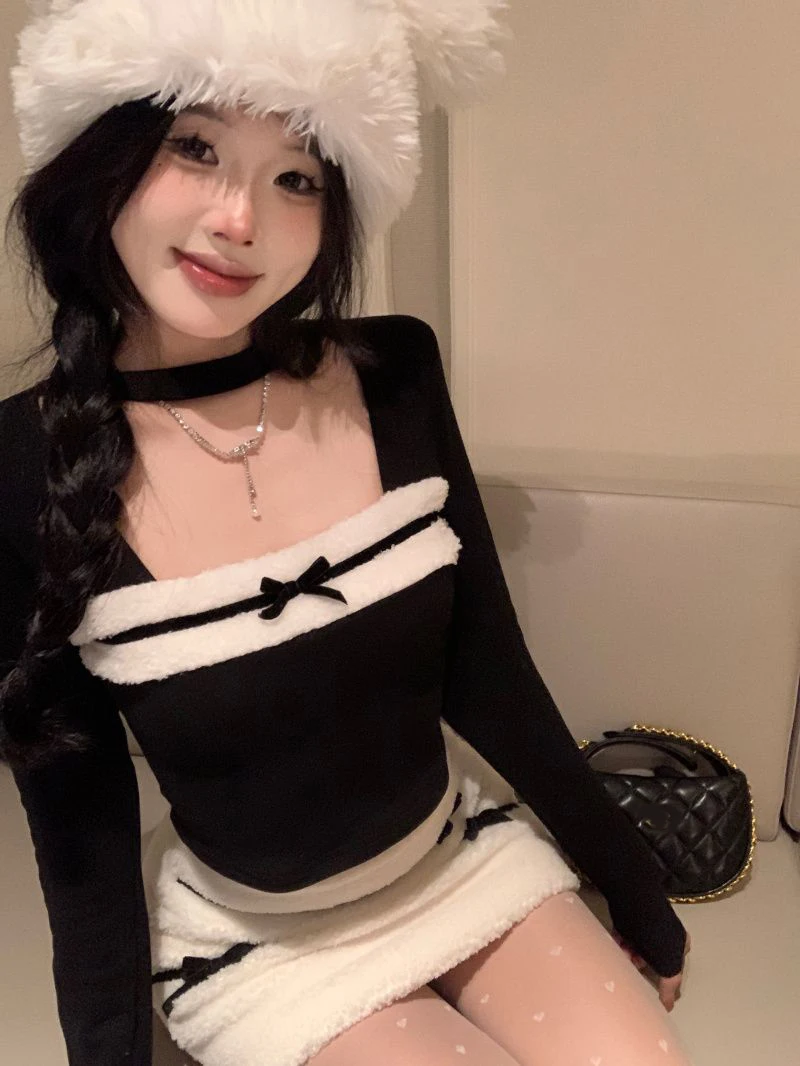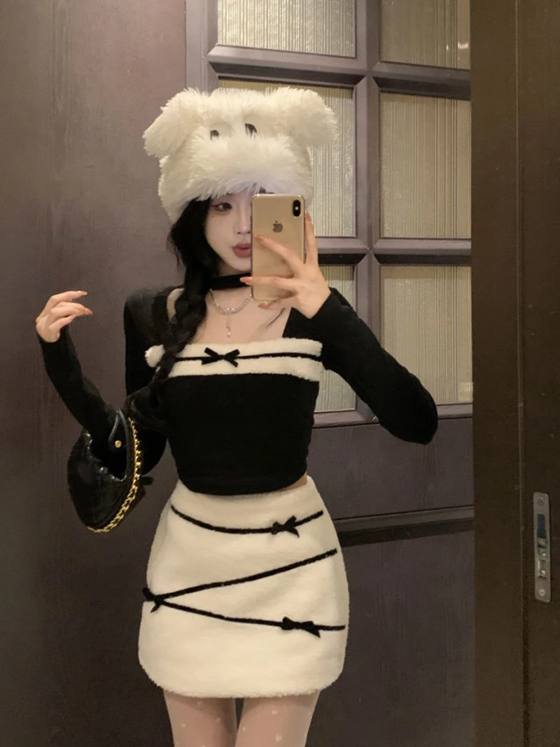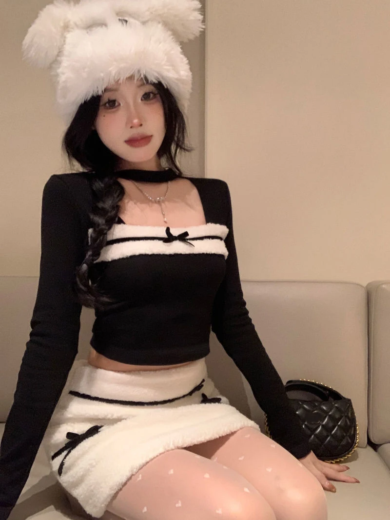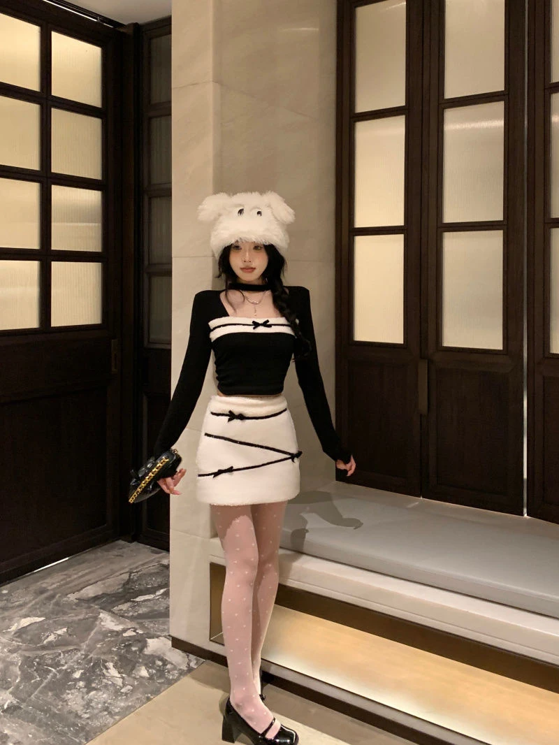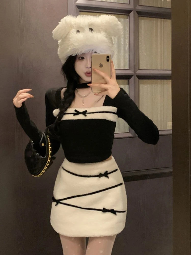 LIZAKOSHT  -  Women Sexy Two Piece Sets Fall Winter Long Sleeve Hollow Out Patchwork Cropped Tops Fashion Bow Striped Hotsweet Sexy Mini Skirt