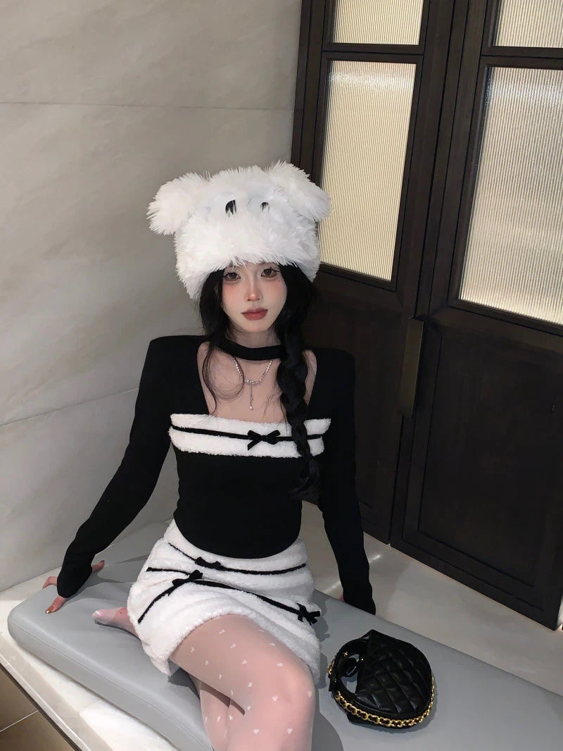 LIZAKOSHT - Women Sexy Two Piece Sets Fall Winter Long Sleeve Hollow Out Patchwork Cropped Tops Fashion Bow Striped Hotsweet Sexy Mini Skirt