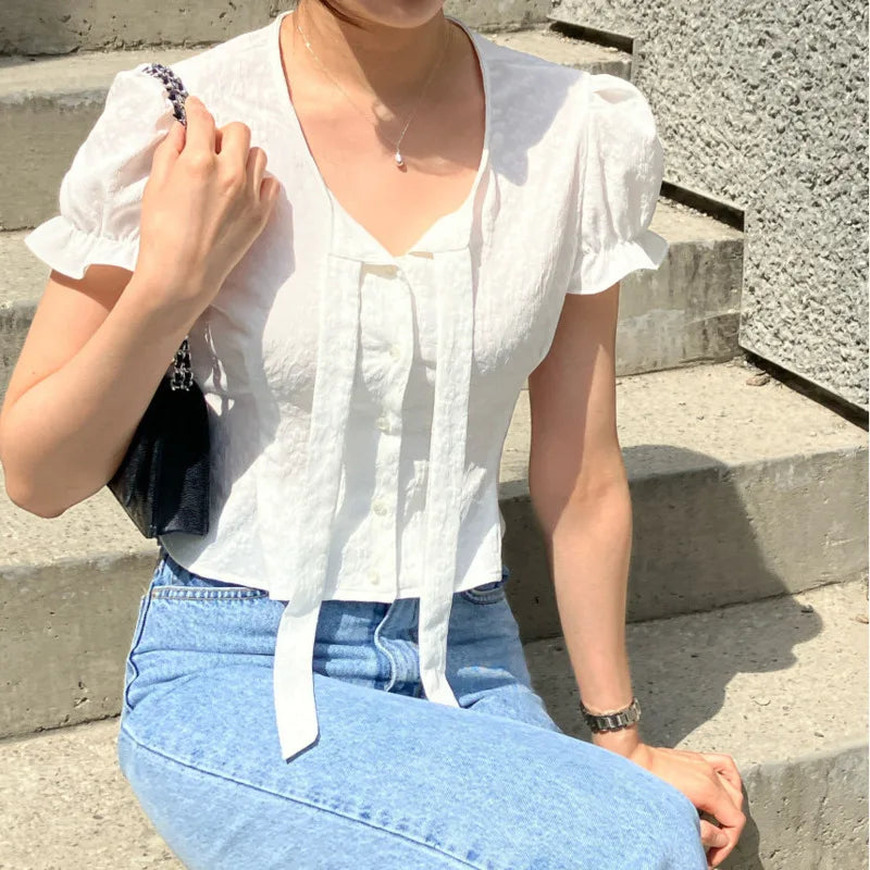 LIZAKOSHT - Women Shirts Casual Slim V-Neck Puff Sleeve Lace-up Solid Cardigan Fashion Sweet Style Chic High Waist Short Blouses Streetwear