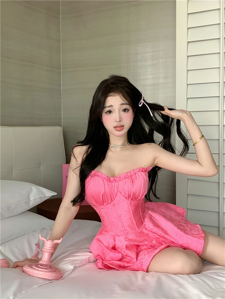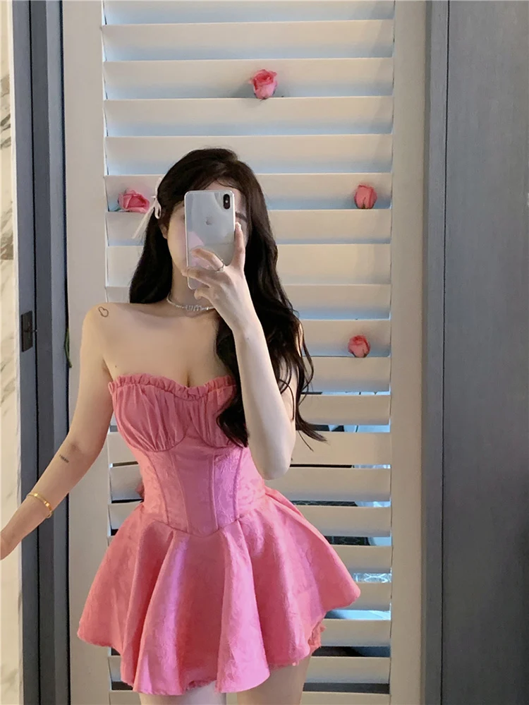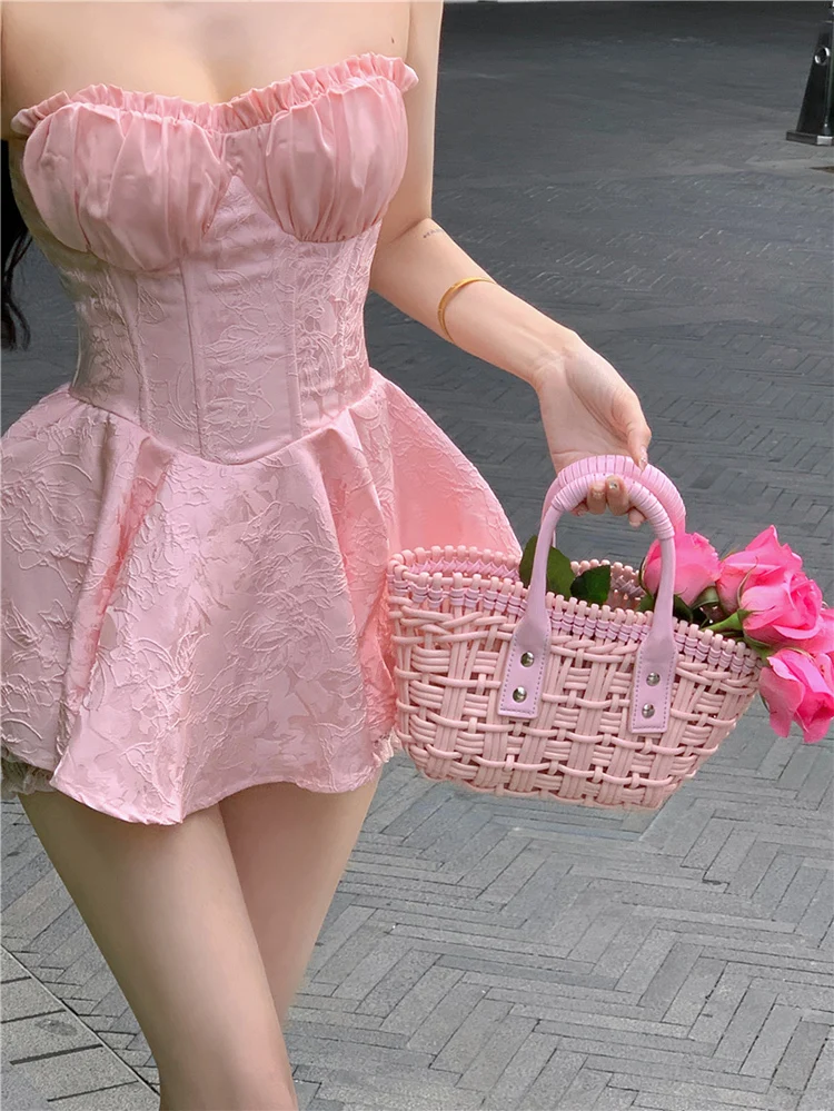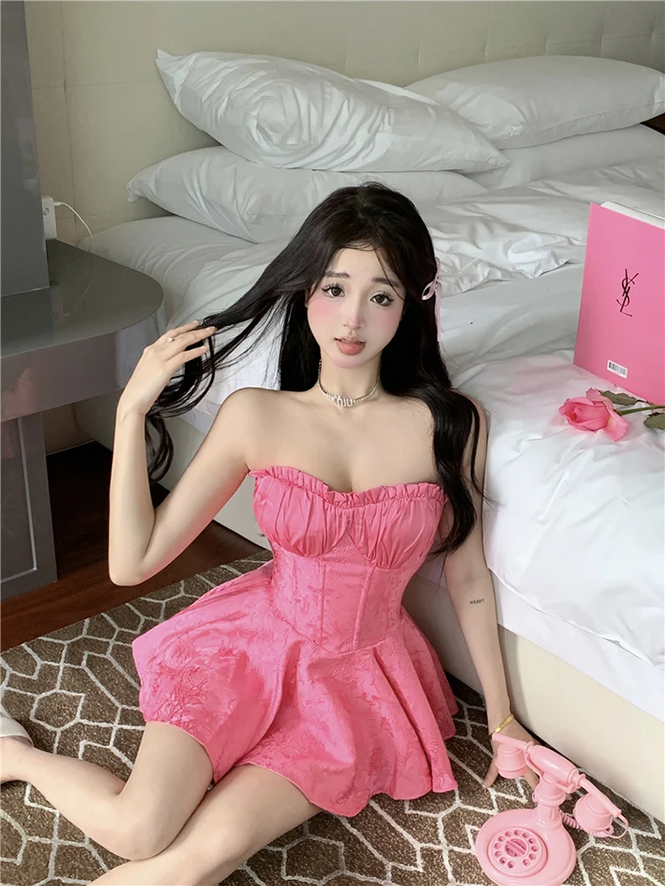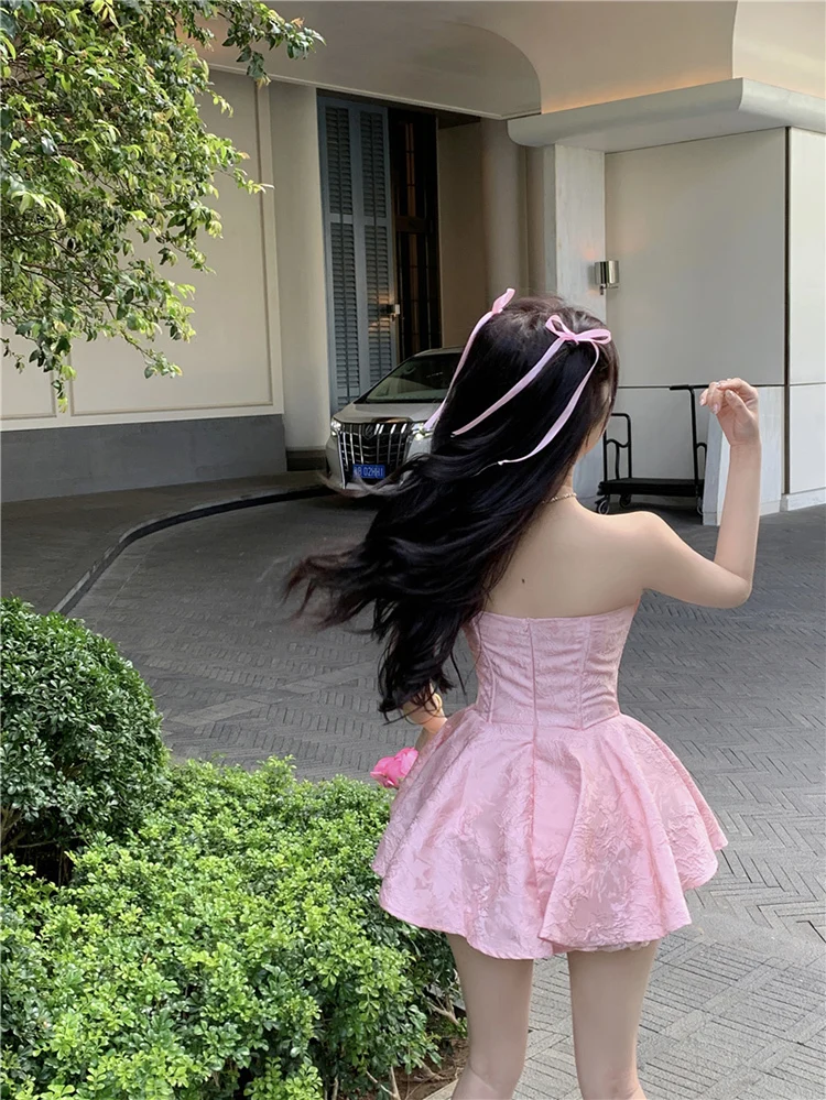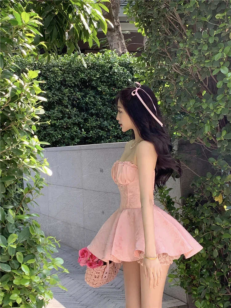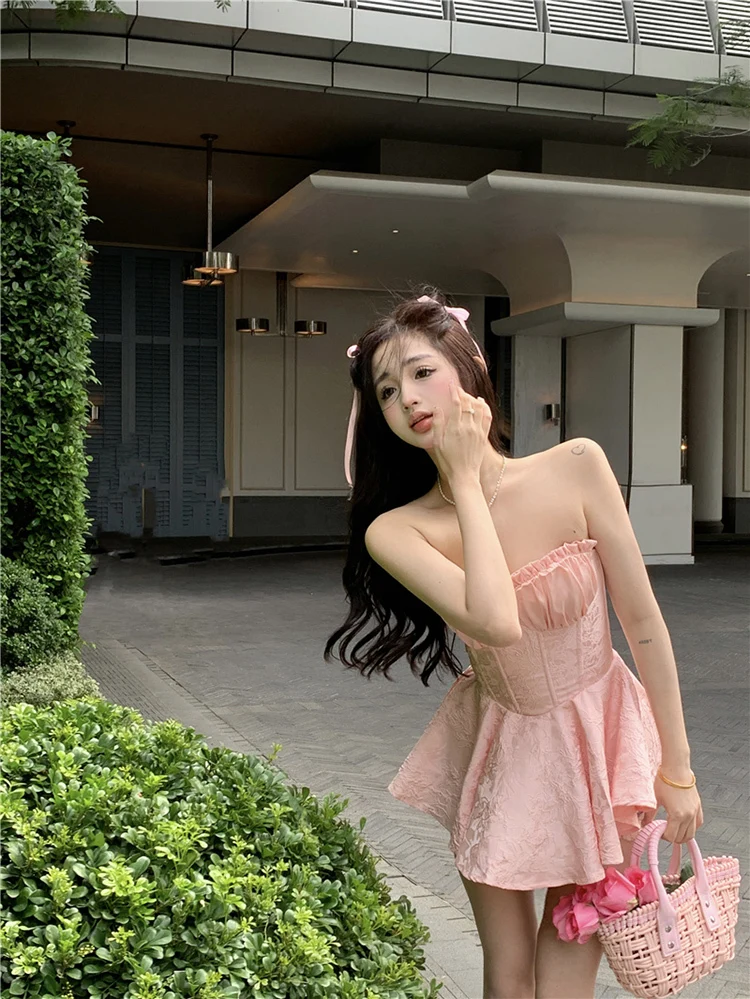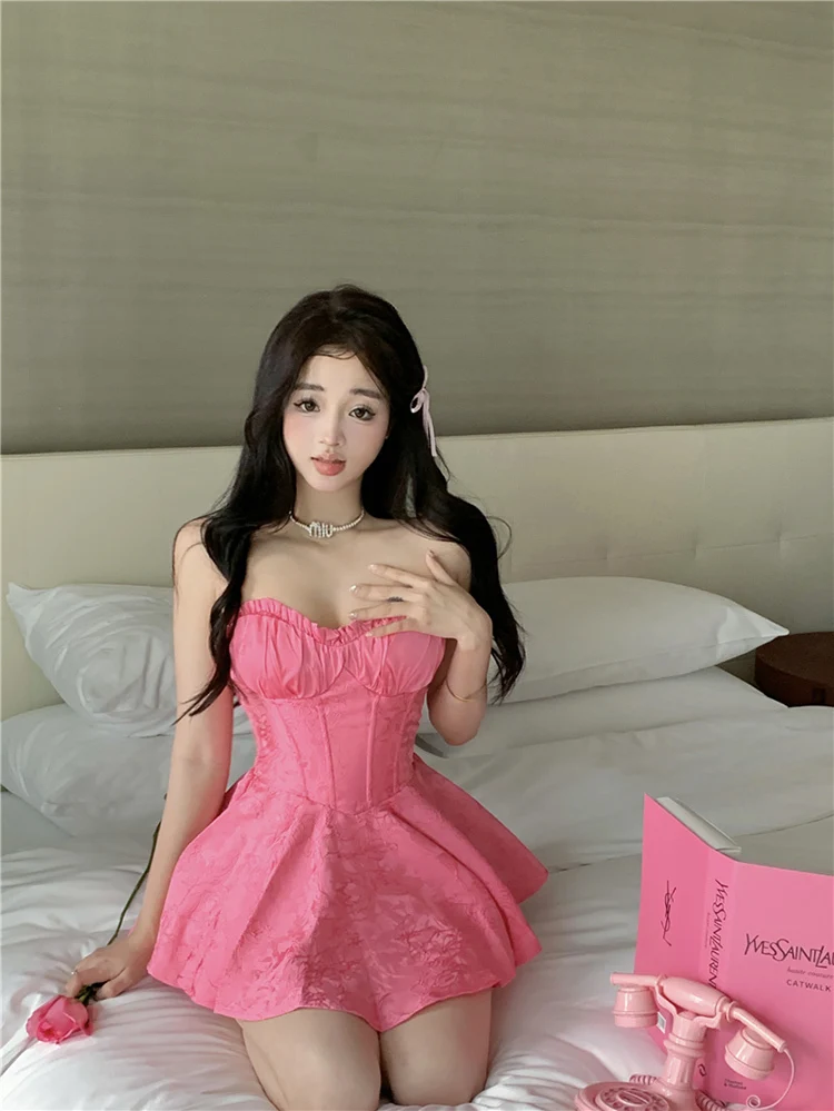 LIZAKOSHT - Women Sleeveless Off Shoulder Sweet Mini Dress Corset Boning Lace Jacquard Slim Fit Pink Sexy Strapless Summer Dress
