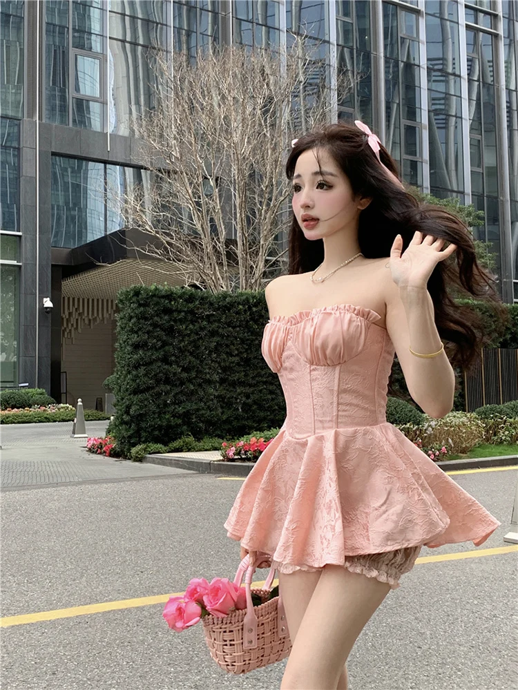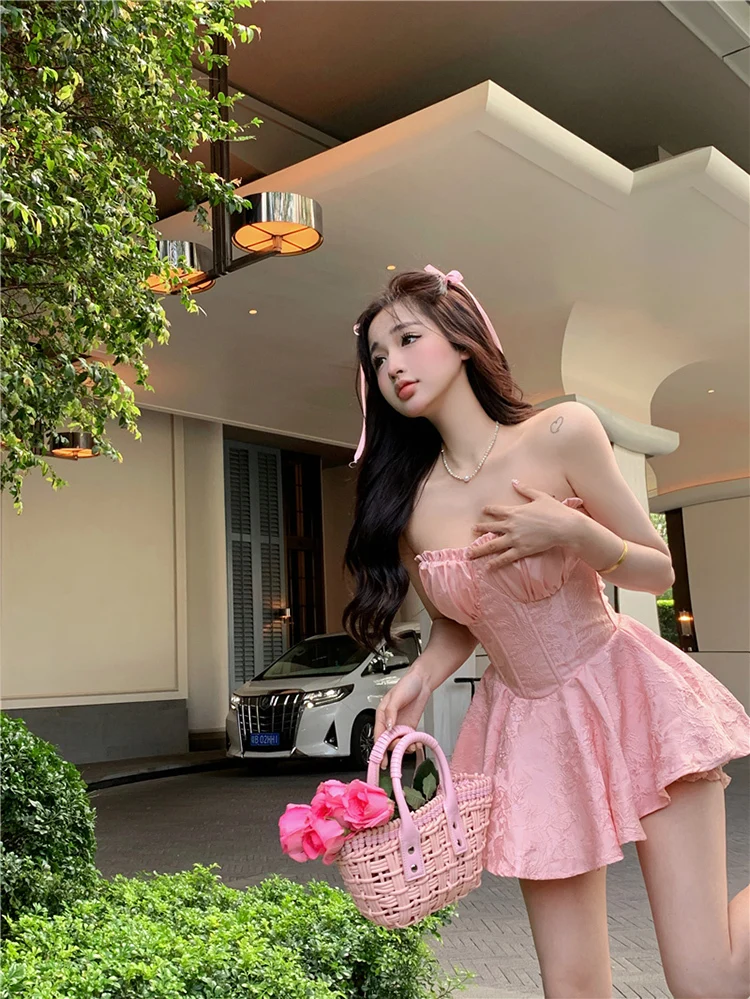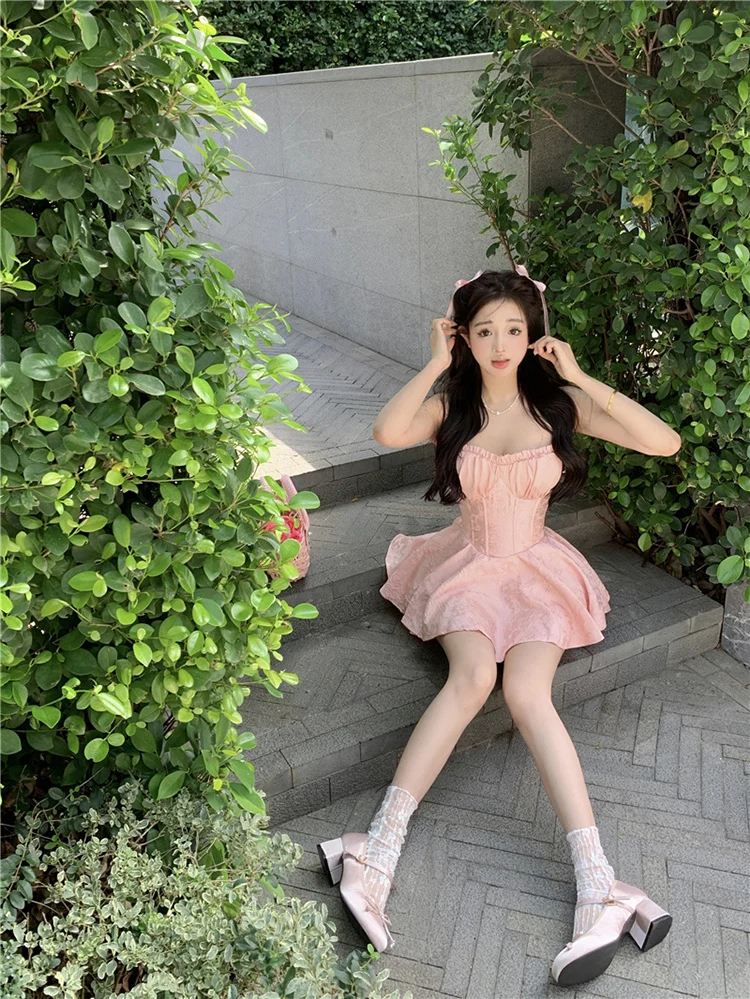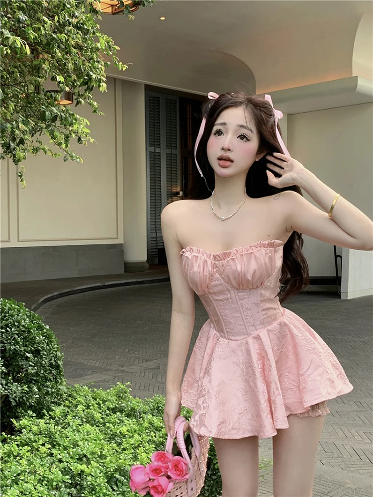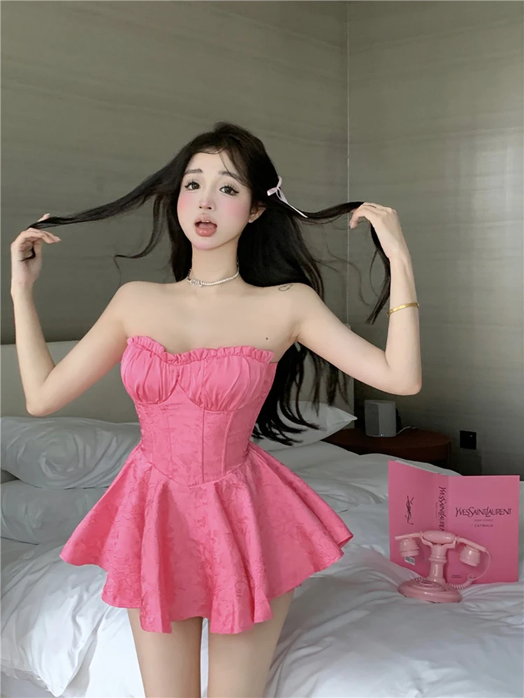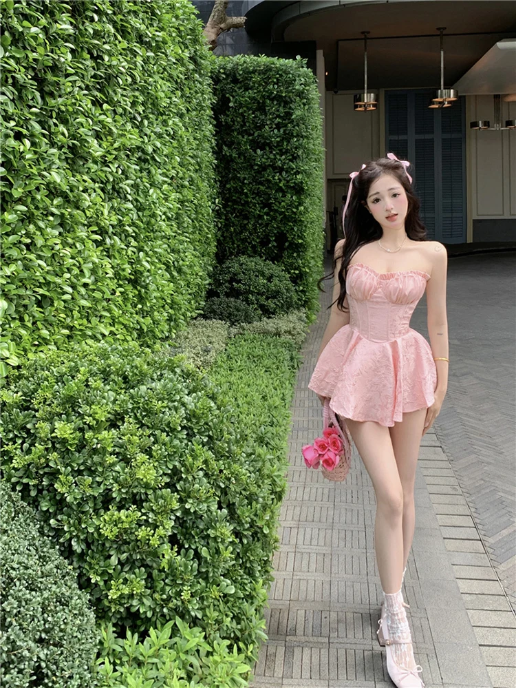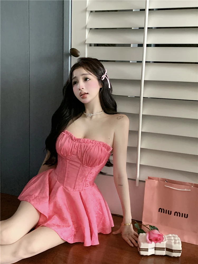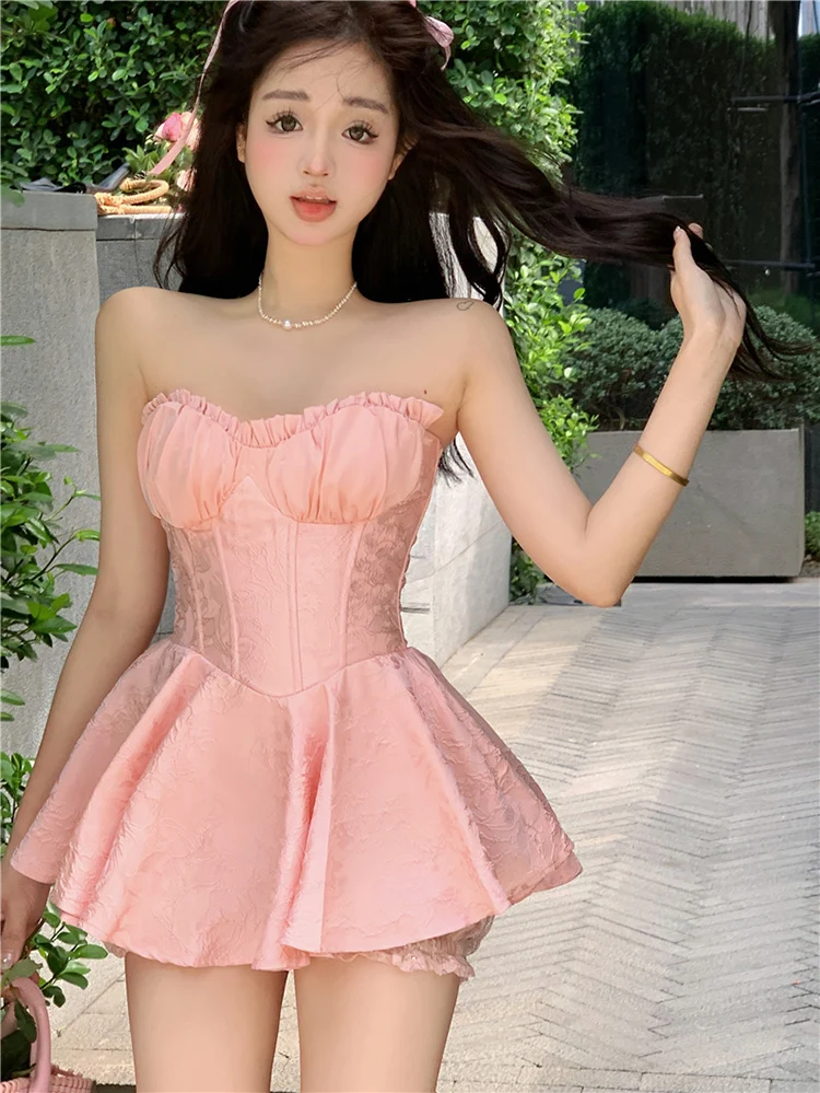 LIZAKOSHT - Women Sleeveless Off Shoulder Sweet Mini Dress Corset Boning Lace Jacquard Slim Fit Pink Sexy Strapless Summer Dress