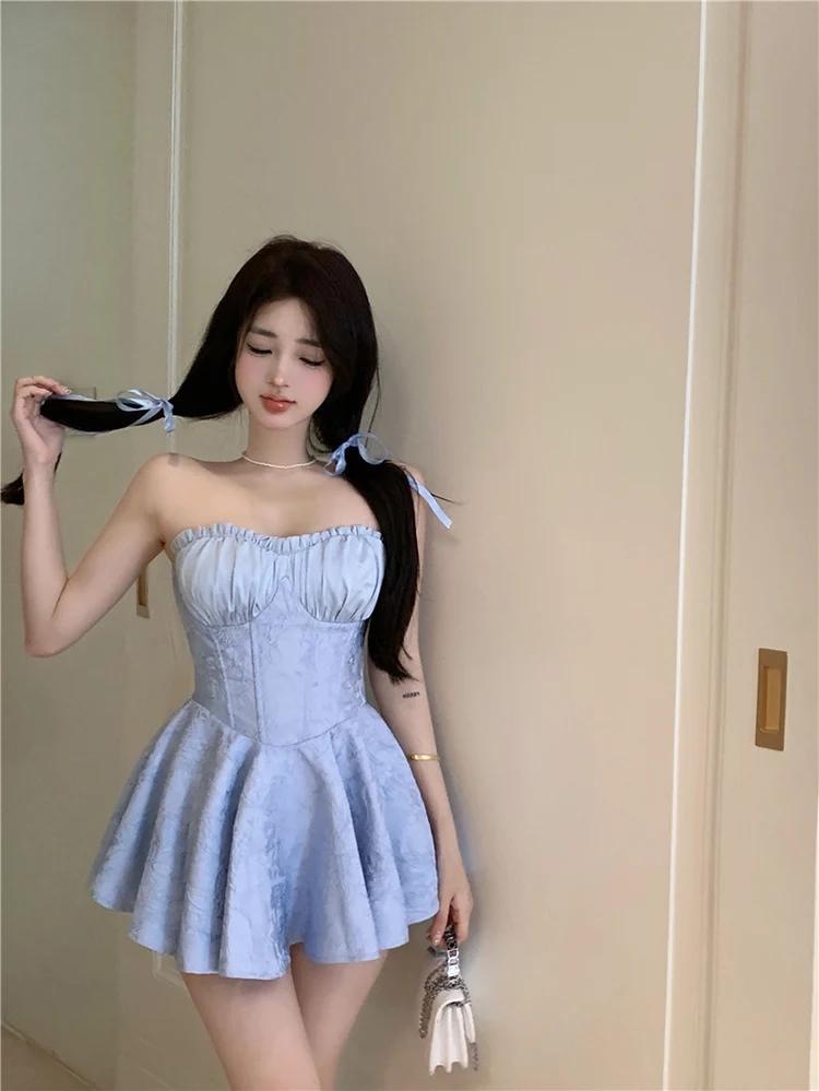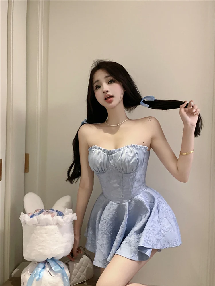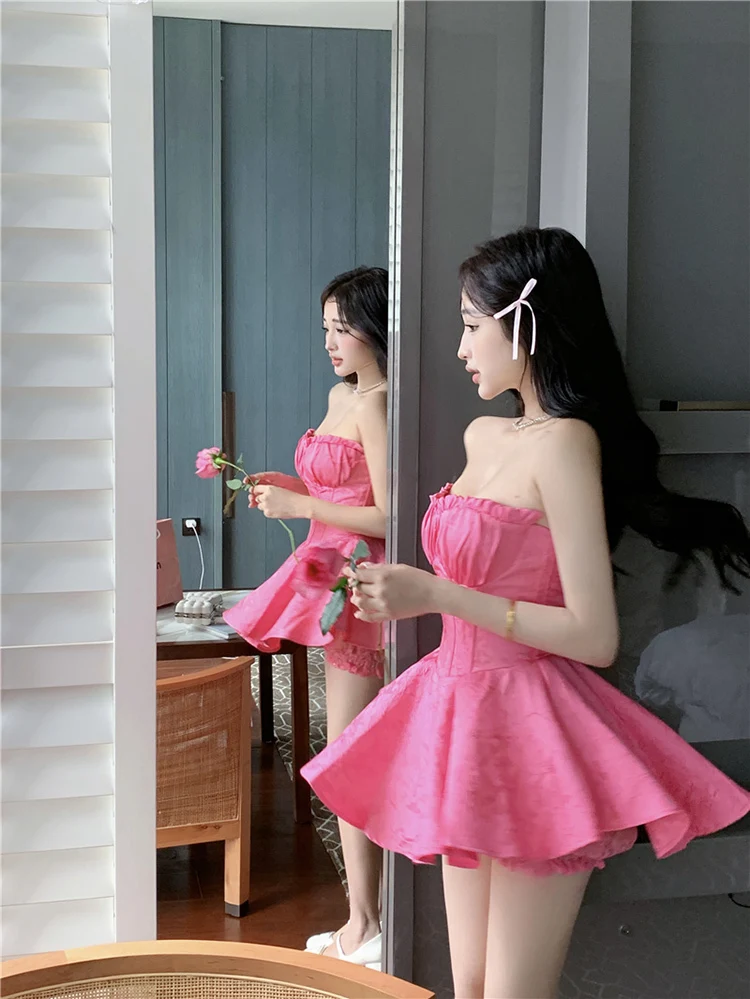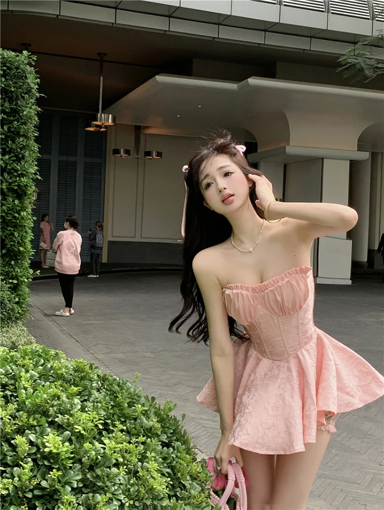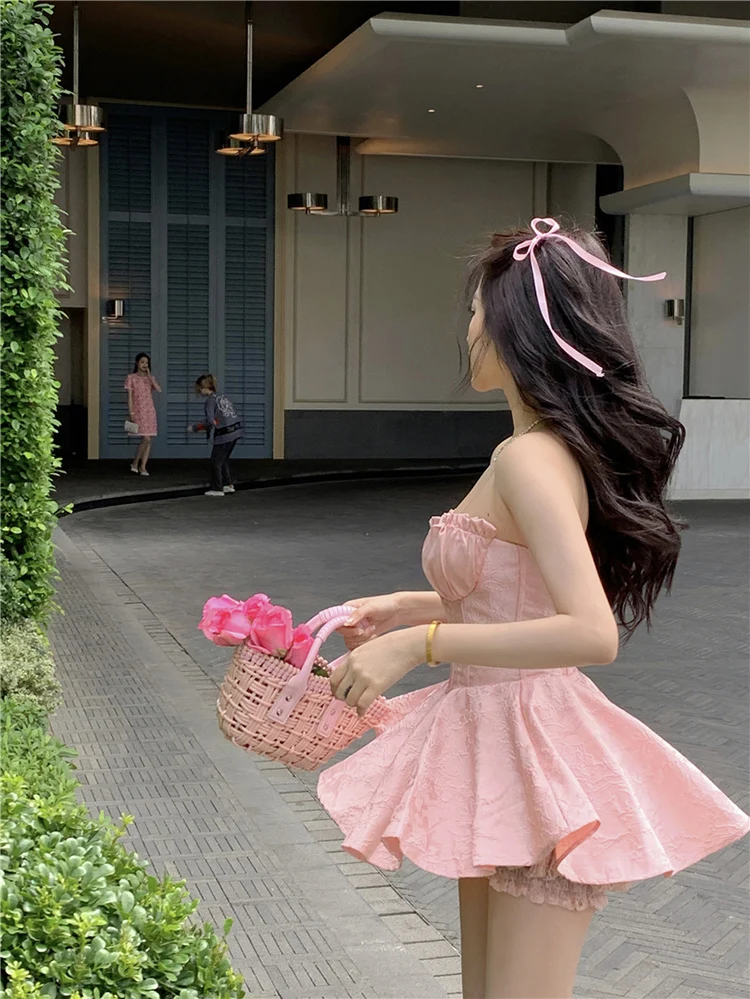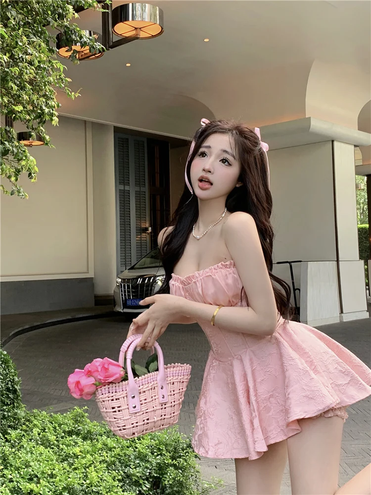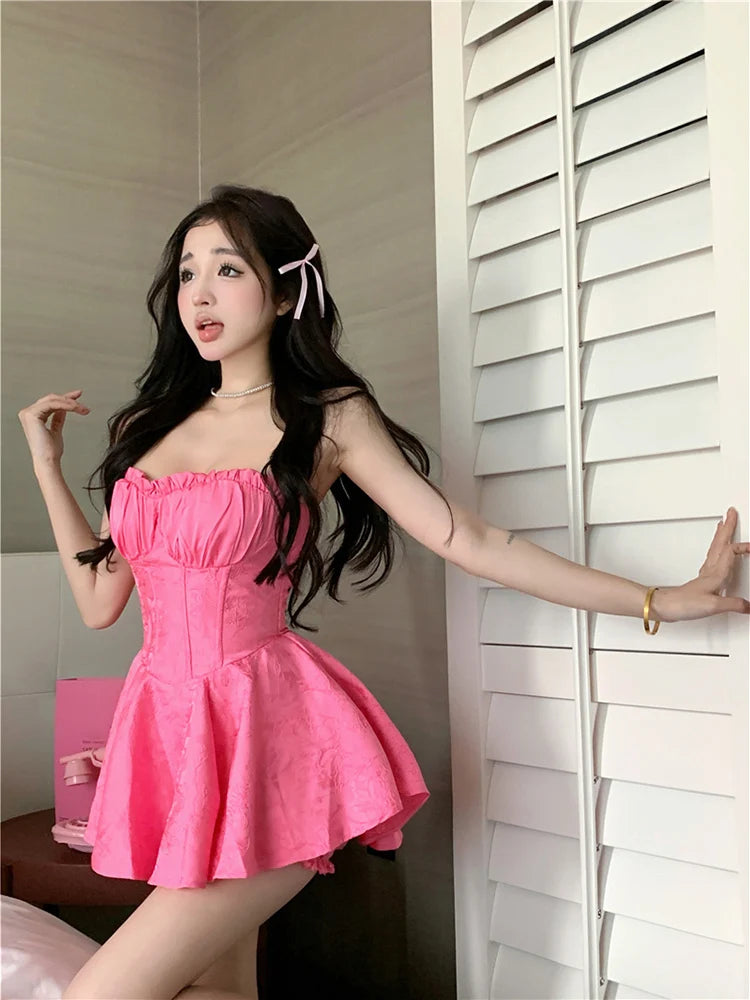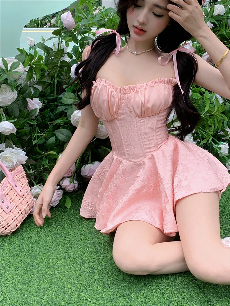 LIZAKOSHT - Women Sleeveless Off Shoulder Sweet Mini Dress Corset Boning Lace Jacquard Slim Fit Pink Sexy Strapless Summer Dress
