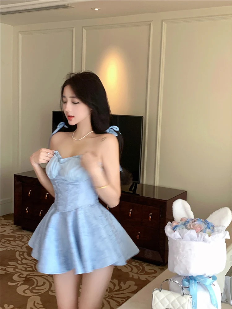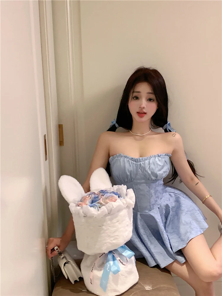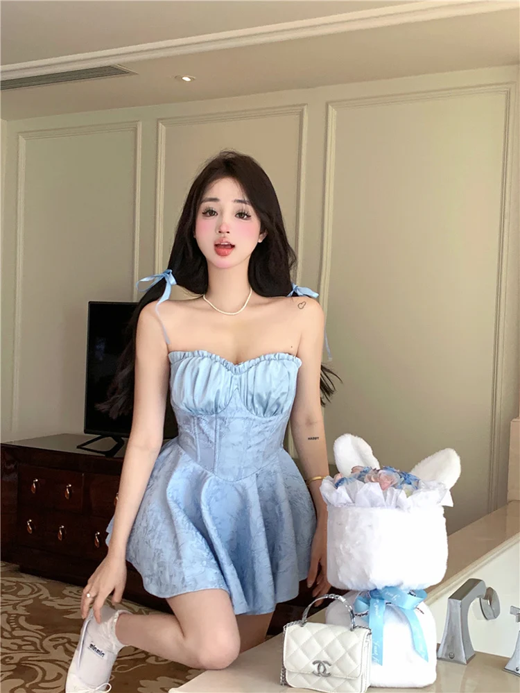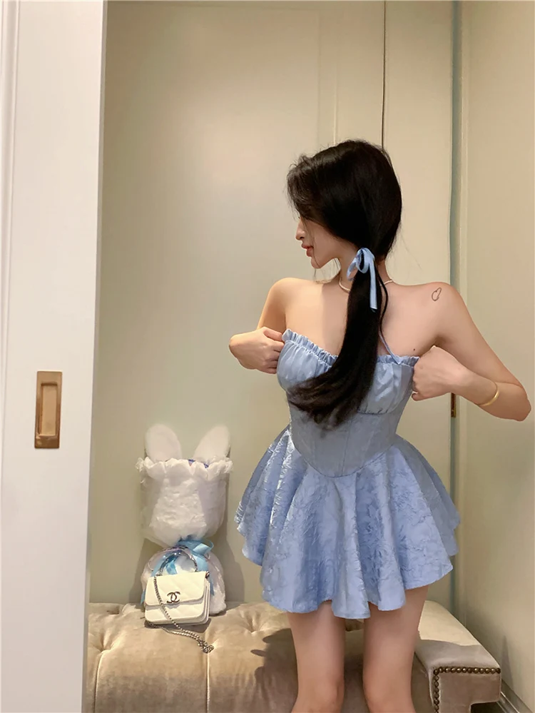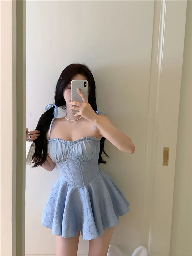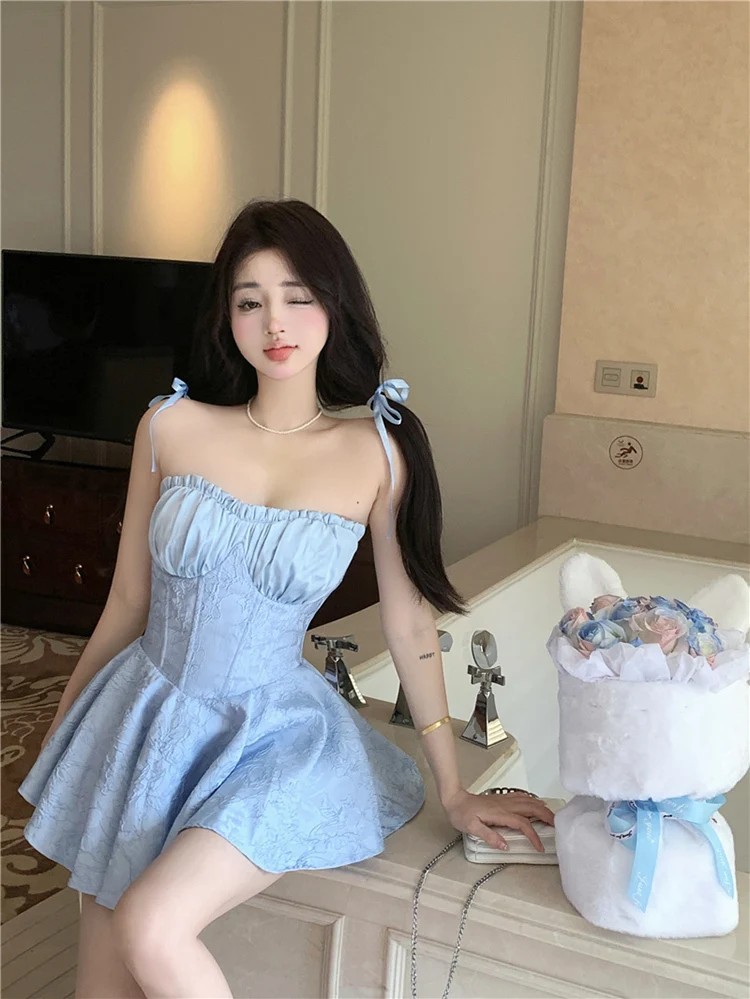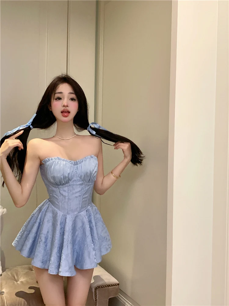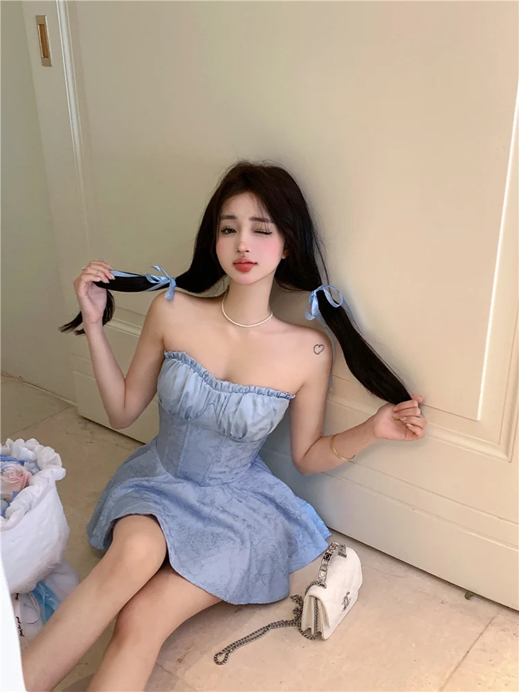 LIZAKOSHT - Women Sleeveless Off Shoulder Sweet Mini Dress Corset Boning Lace Jacquard Slim Fit Pink Sexy Strapless Summer Dress