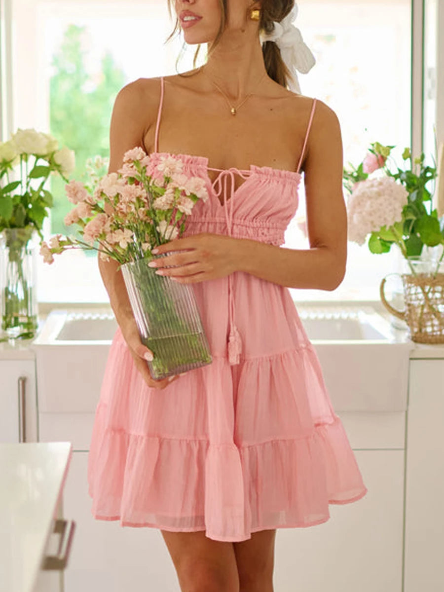 LIZAKOSHT - Women Solid Color A-line Dress Summer Spaghetti Straps Backless Tie-up Hollowed Out Mini Dresses Beach Travel Sundress Fairycore