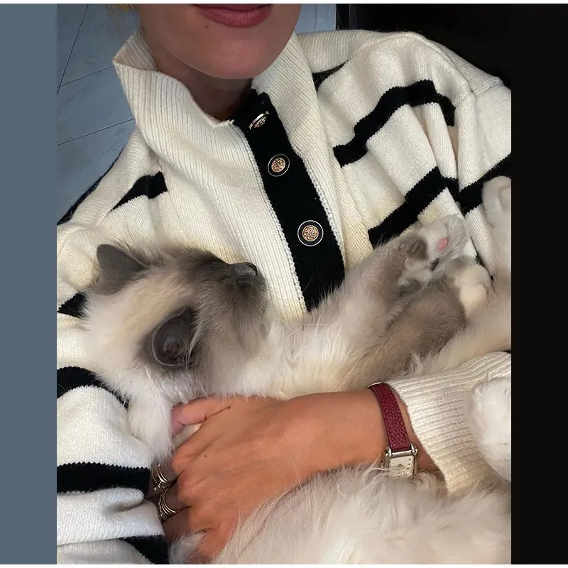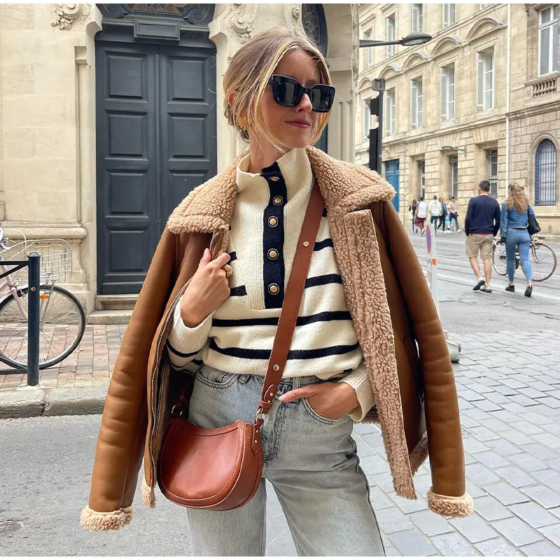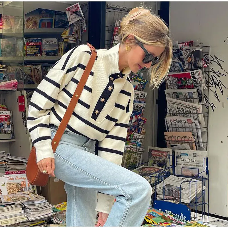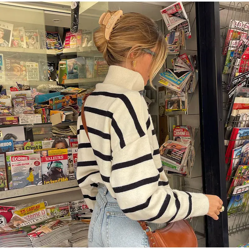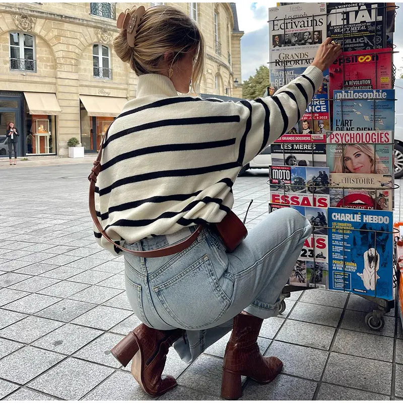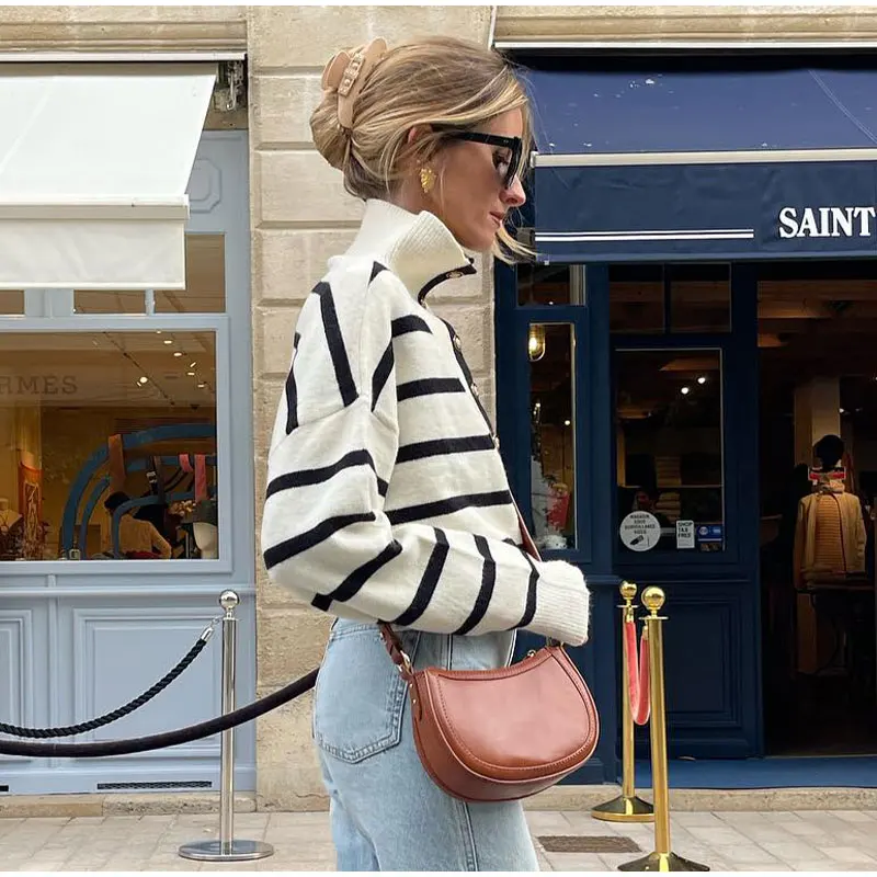 LIZAKOSHT Women Stand Up Collar Striped Knitted Sweater Fashion Long Sleeve Loose Casual Pullovers Female Fall Winter Street Jumper