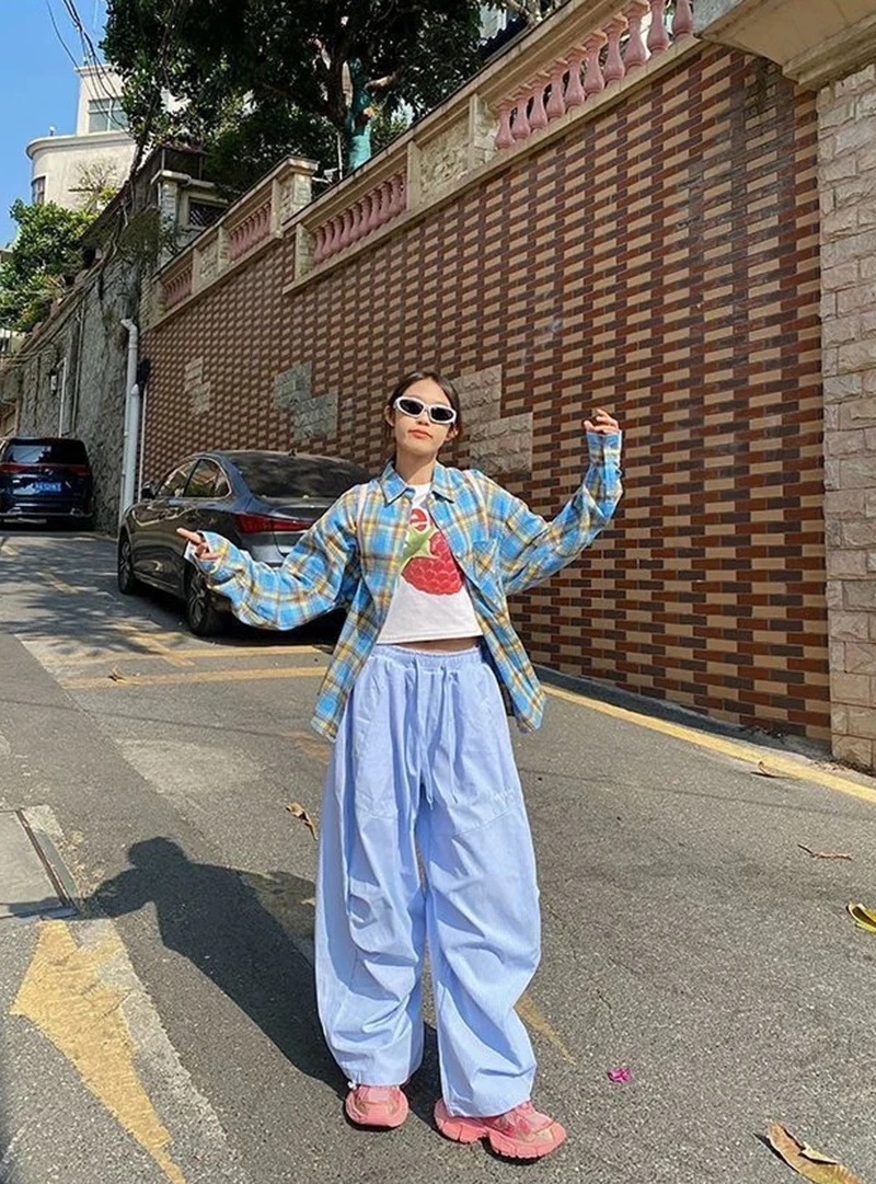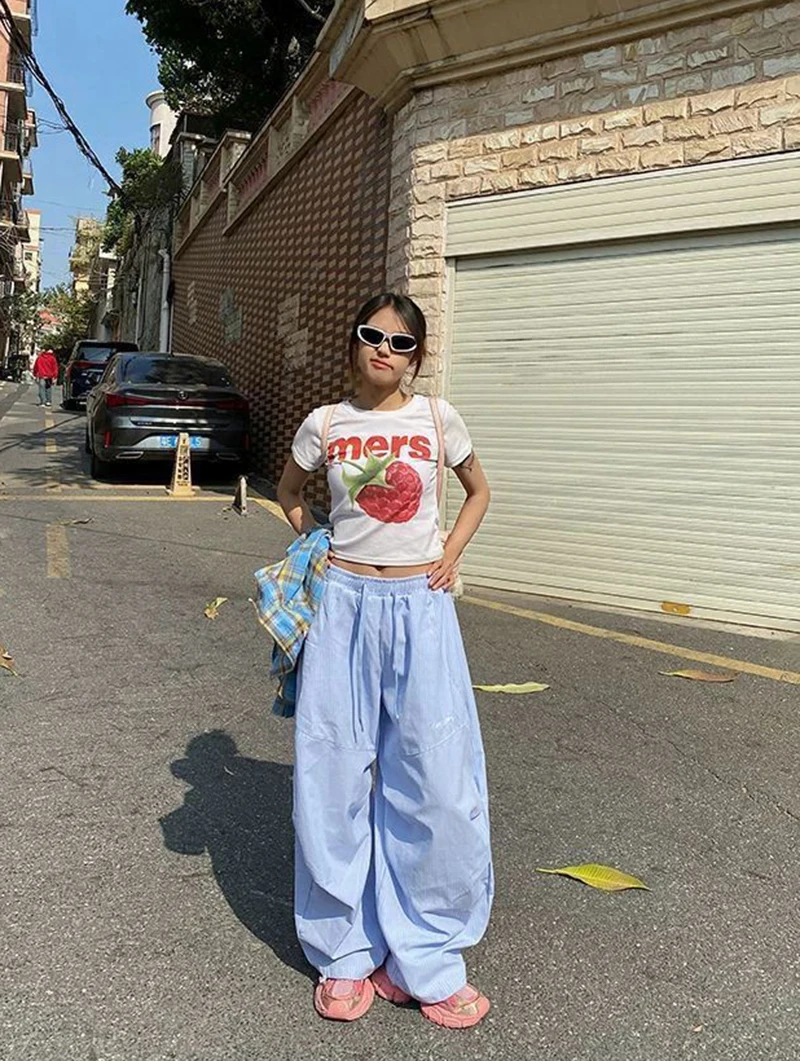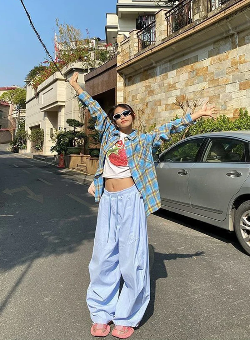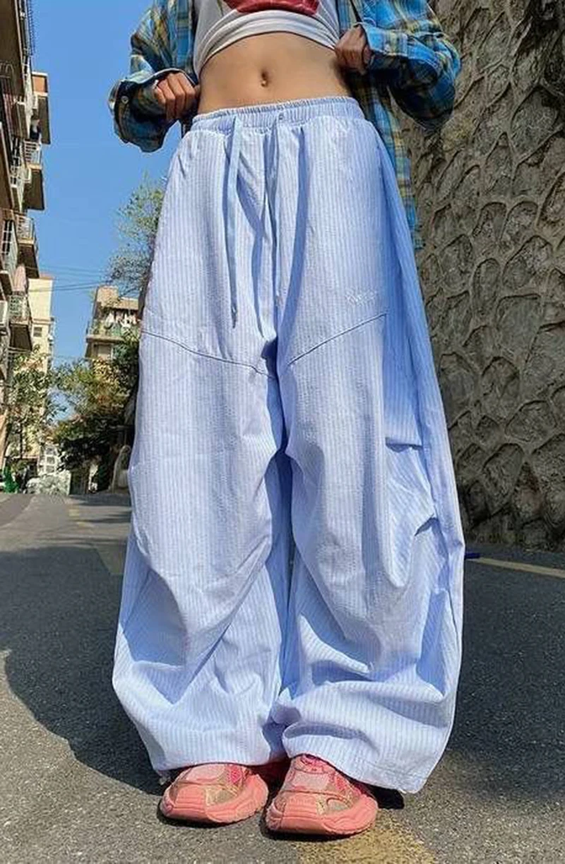 LIZAKOSHT - Women Striped Jazz Dance Pants Blue Loose Casual Lazy Wide Leg Pants Harajuku Y2K Summer American Streetwear Cargo Pants