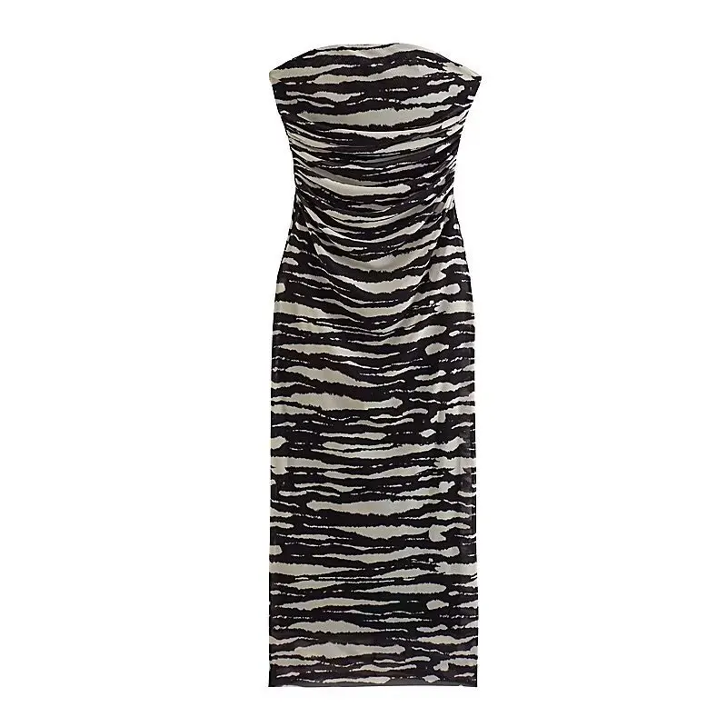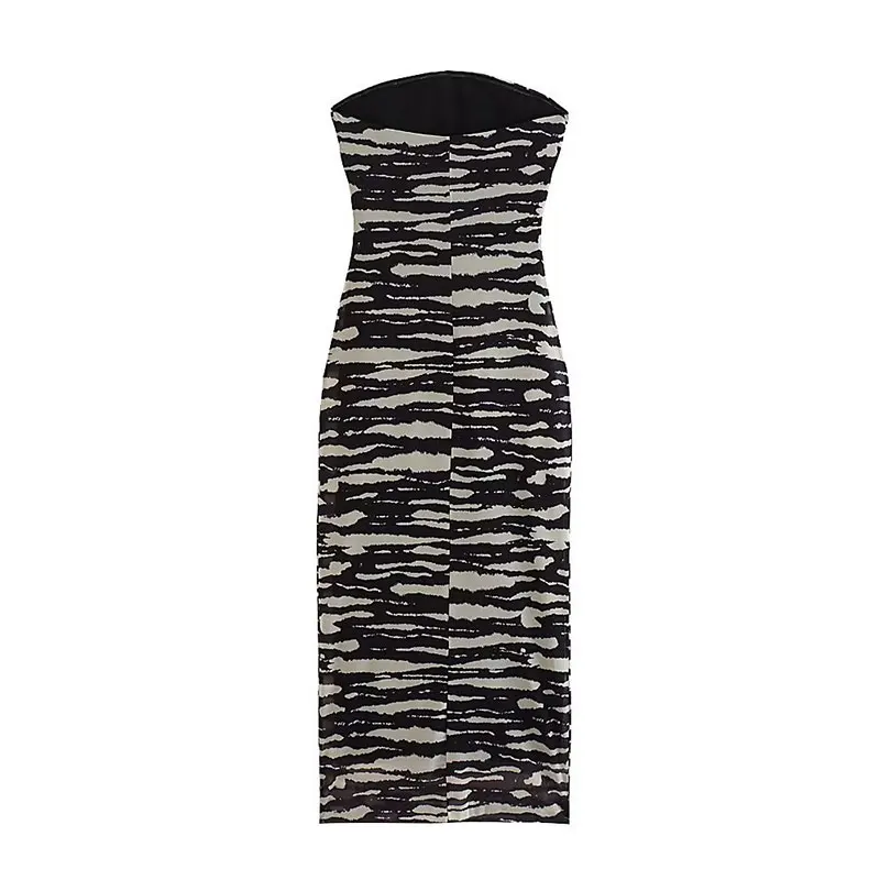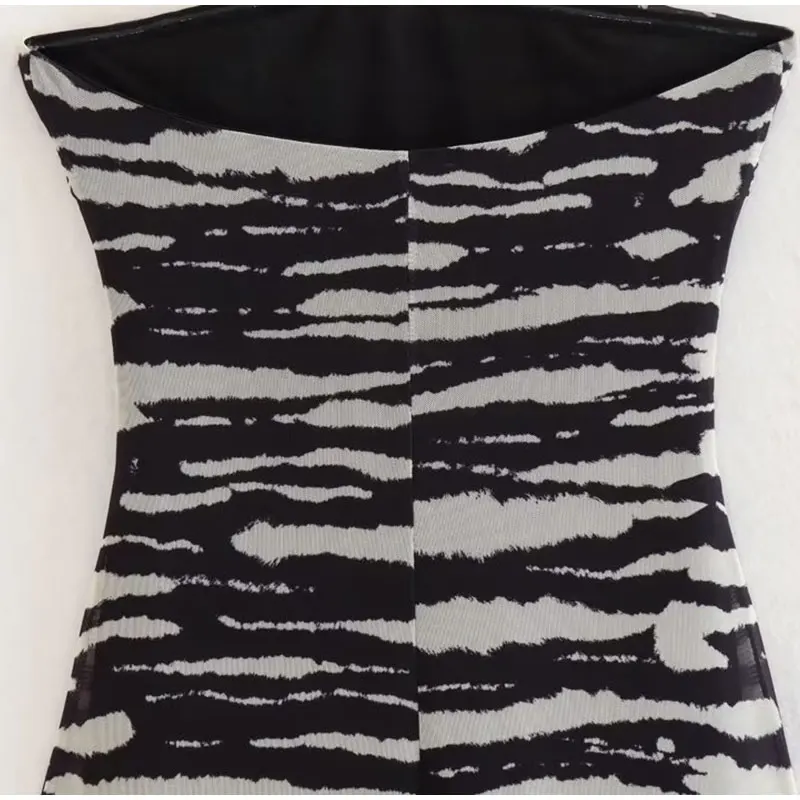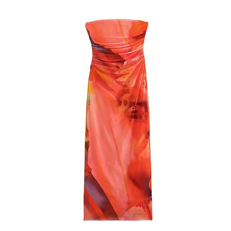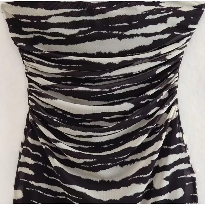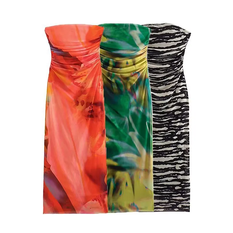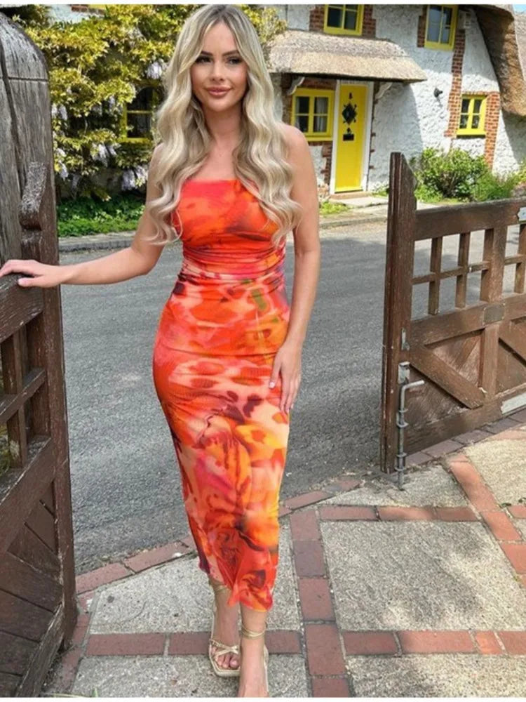 Lizakosht Women Summer Print Tulle Strapless Midi Dress Sexy Backless Sleeveless Bodycon Dresses Chic Chest Wrapping Pleated Beach Vestido