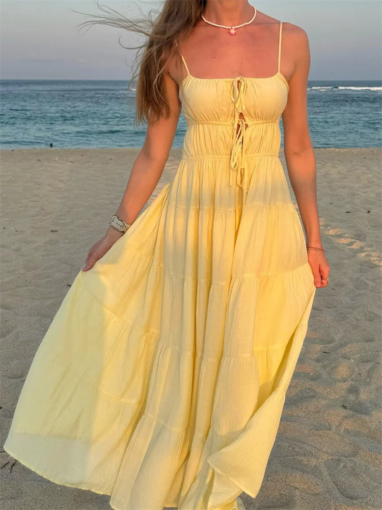 LIZAKOSHT - Women Summer Sleeveless Sling Dress Casual Solid Front Tie-up Ruffles A-Line Party Dress Vacation Cocktail Streetwear